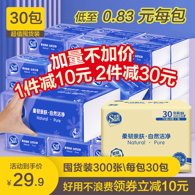 天猫太阳洗护旗舰店现售价29.9元,领取10元优惠券,到手价19.9元包邮。购买过的用户反馈:抽纸质可以,容易拉抽,湿水不容易破。
