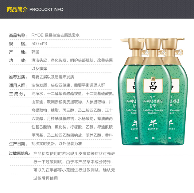 这款Ryo绿吕 舒盈清润控油无硅油洗发水/护发素,韩国原装进口,使用无硅油配方,洗发水/深层清洁头皮毛孔,护发素/净化头皮,护理秀发。