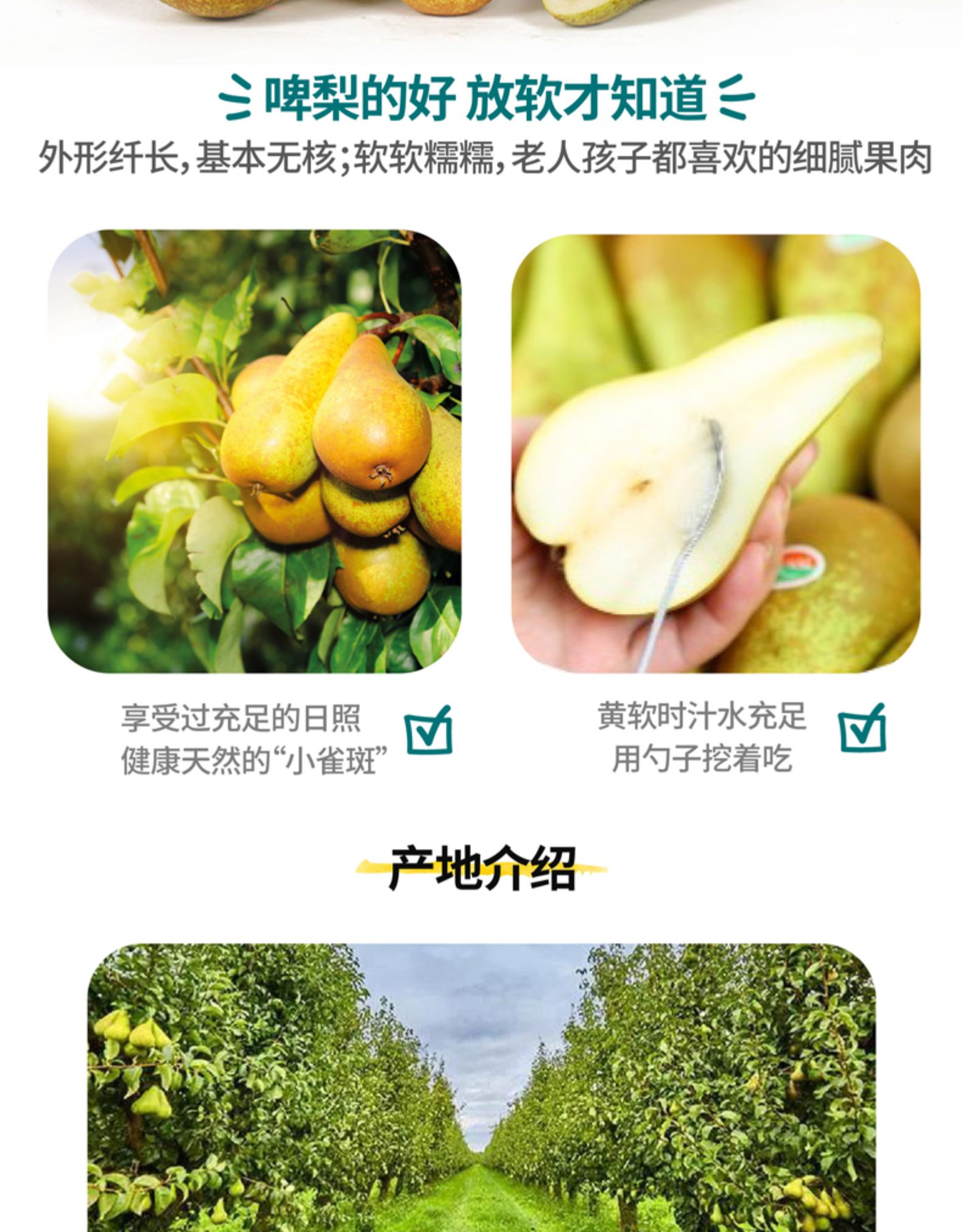 这款啤梨来自比利时果农拍卖会的精选供应商BFV,比利时原产,享受充足日照,具有健康天然的“小雀斑”,外形纤长,基本无核,黄软时汁水充足,果肉细腻,可以直接用勺子挖着吃,颗颗自然成熟,手工采摘,每一粒都来自于比利时北部的梨田。