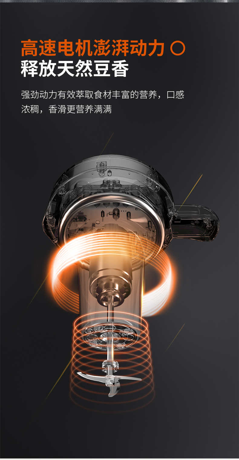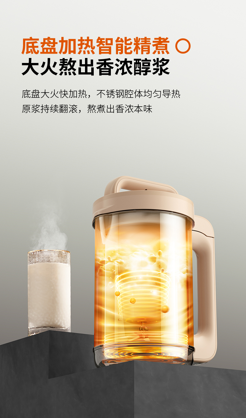 再运用无网研磨,利用水流涡流集中豆料进行粉碎,提高粉碎概率和效率研磨时间短,研磨更细腻。研磨好后,自动加热熬煮。采用铝底盘,周圈嵌加热管传热效率高,保证完全加热。