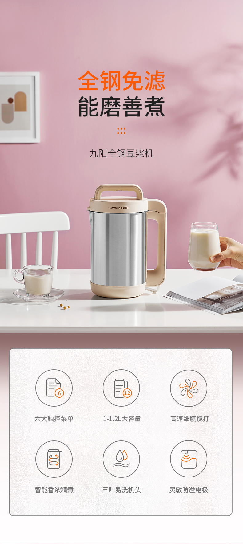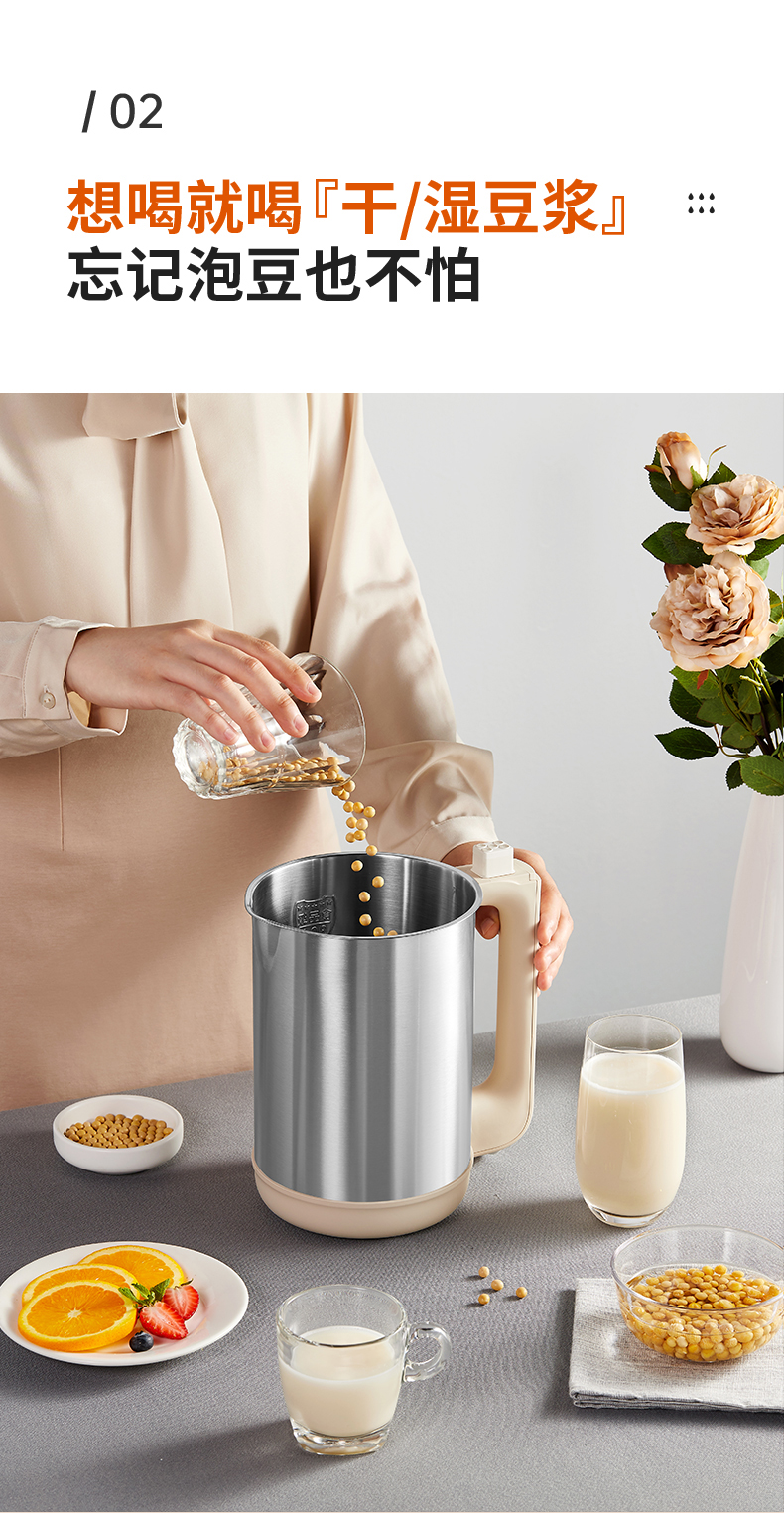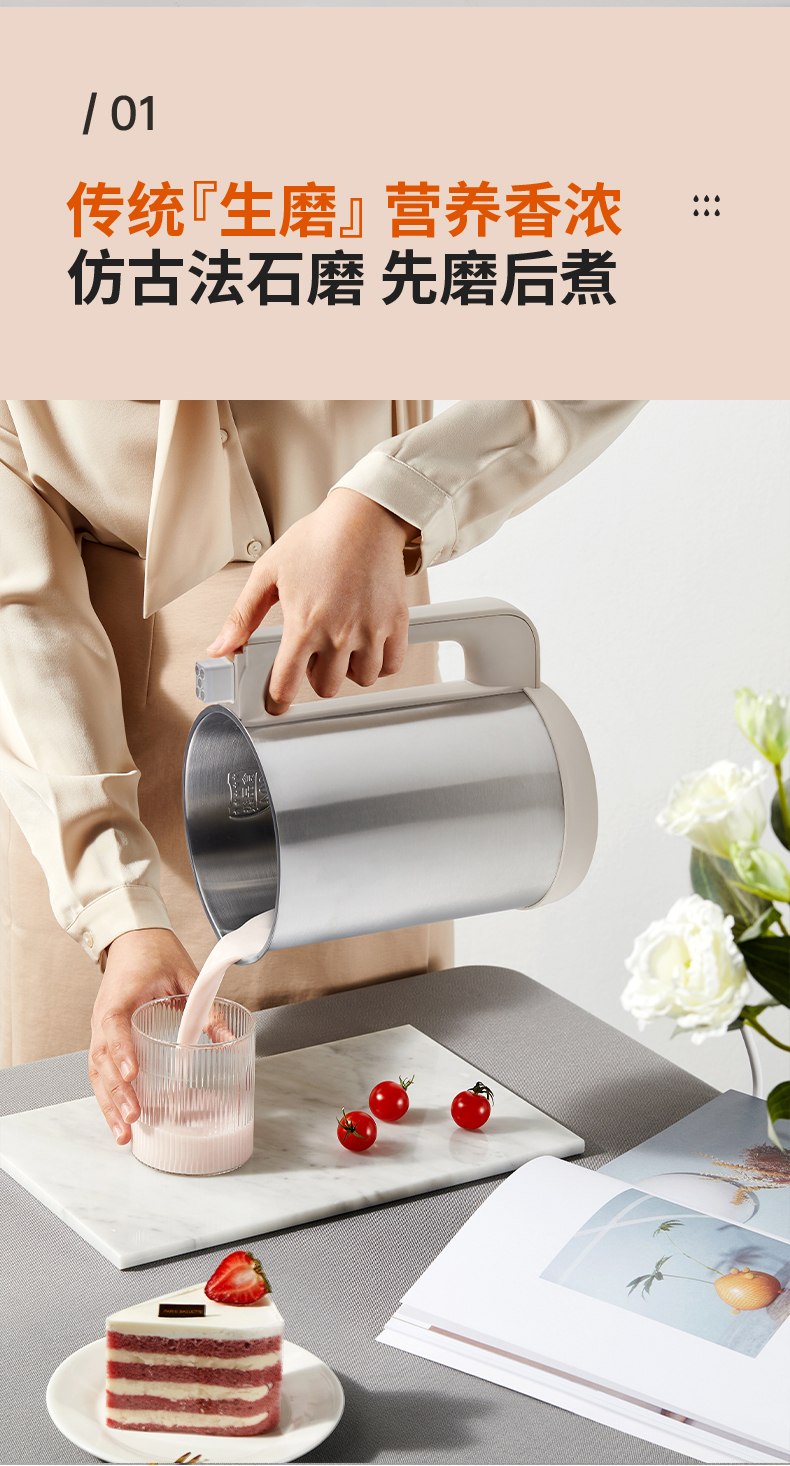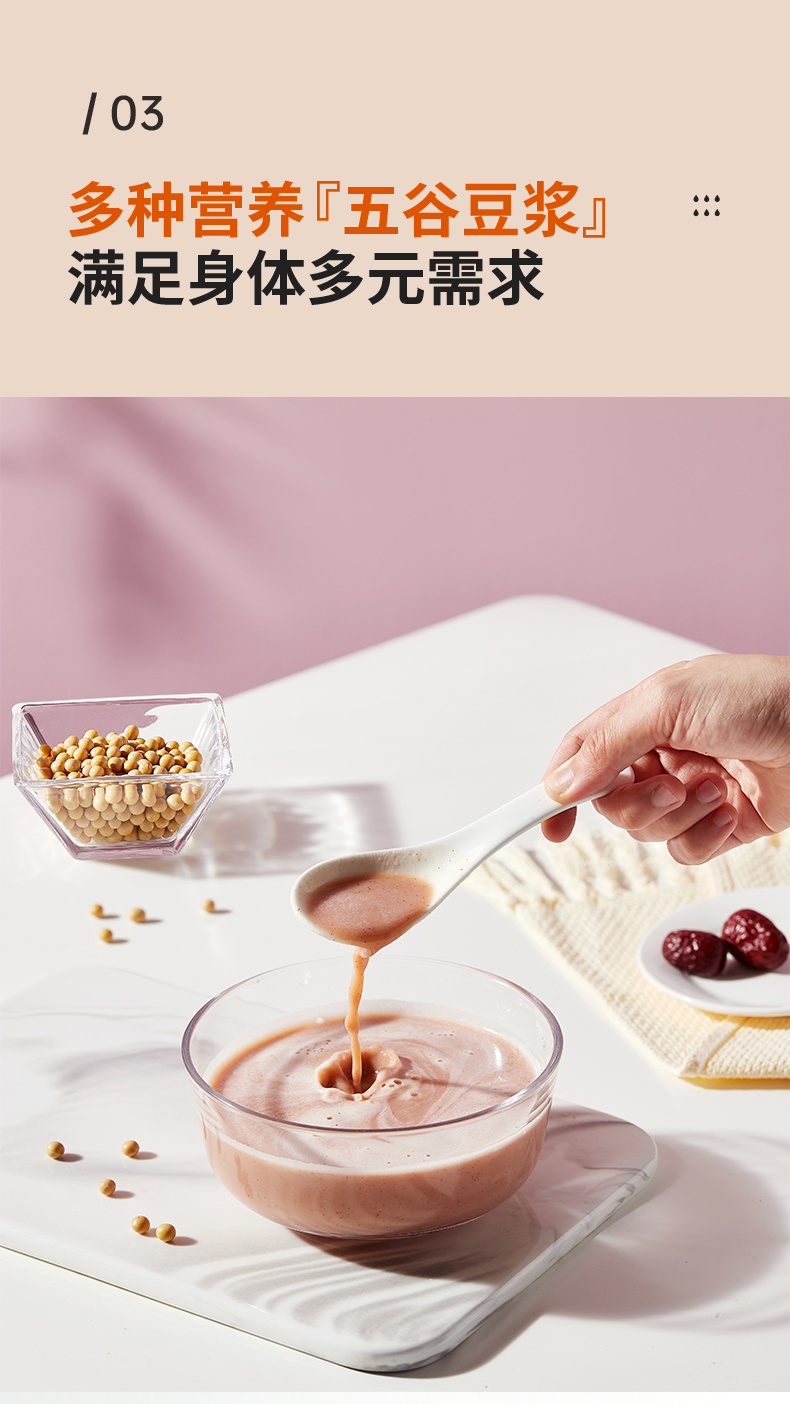 IMD全隐界面智能触碰,高端大气,颜值超高,科技感十足,功能有五谷、湿豆、干豆、米糊、浓汤、果汁、绿豆沙、玉米汁。