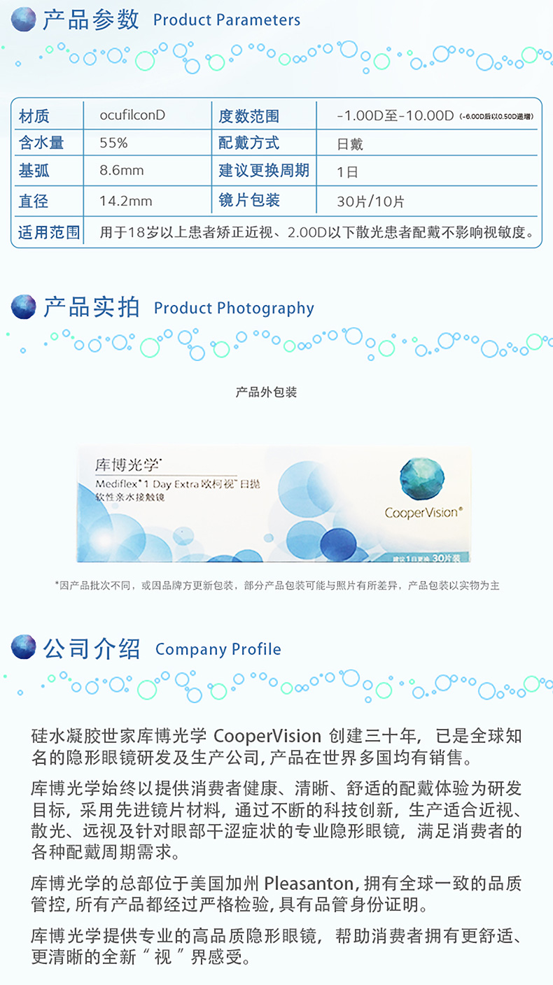 低镜片设计,减少眨眼间与镜片的摩擦,有效降低异物感,增加瞬目的舒适度;镜片边缘采用干式膜铸工艺,使表面更加光滑,成形性好,更易于操作,对初期佩戴者尤其方便。规格:30片。