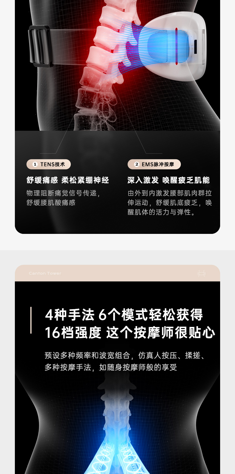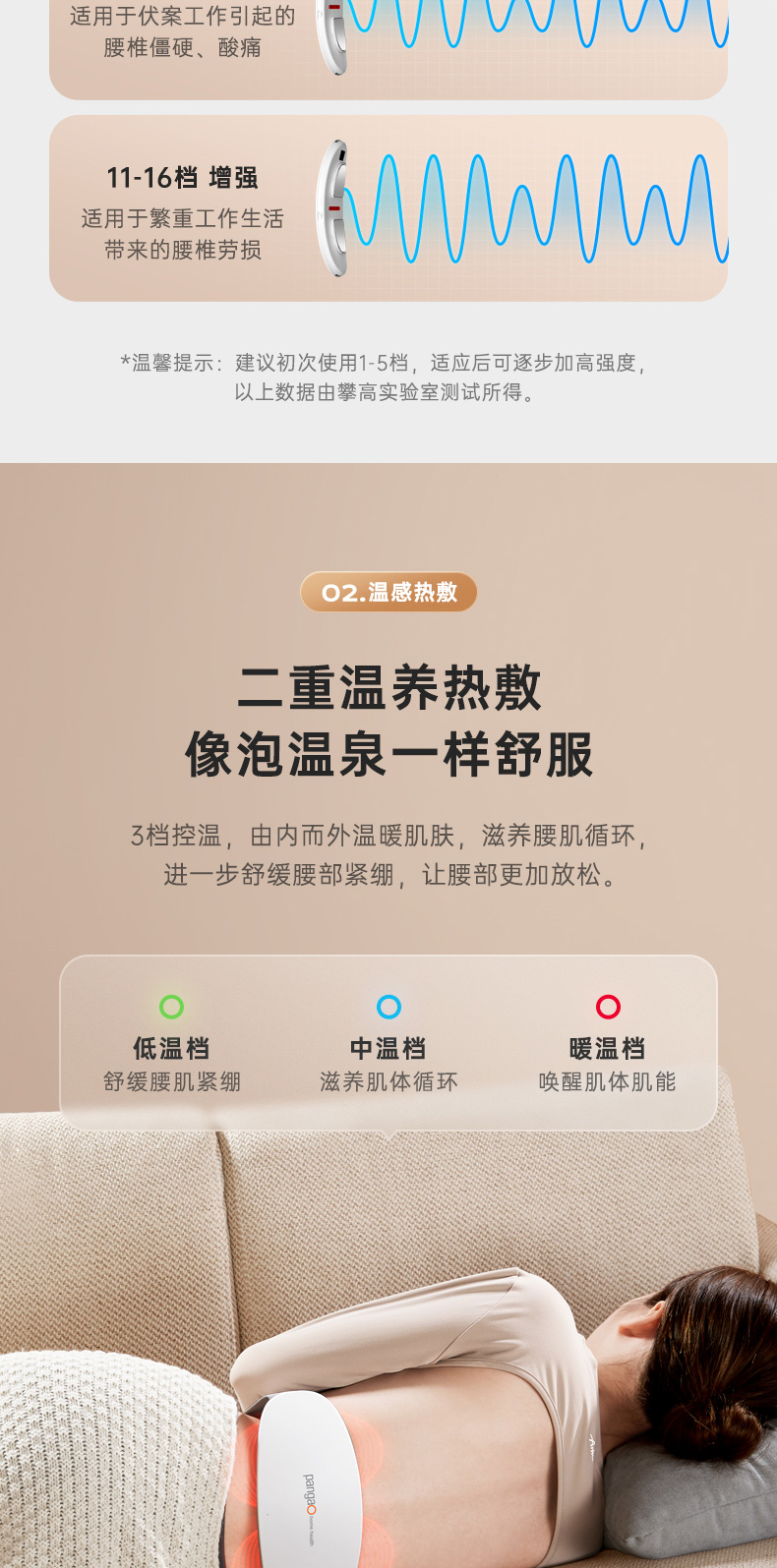 常规脉冲只能舒缓表层酸痛不适,攀高小蛮腰采用VTP双脉冲变频技术,搭TENS+EMS脉冲功能,在舒缓不适的同时焕活锻炼肌肉,给你双倍舒适。