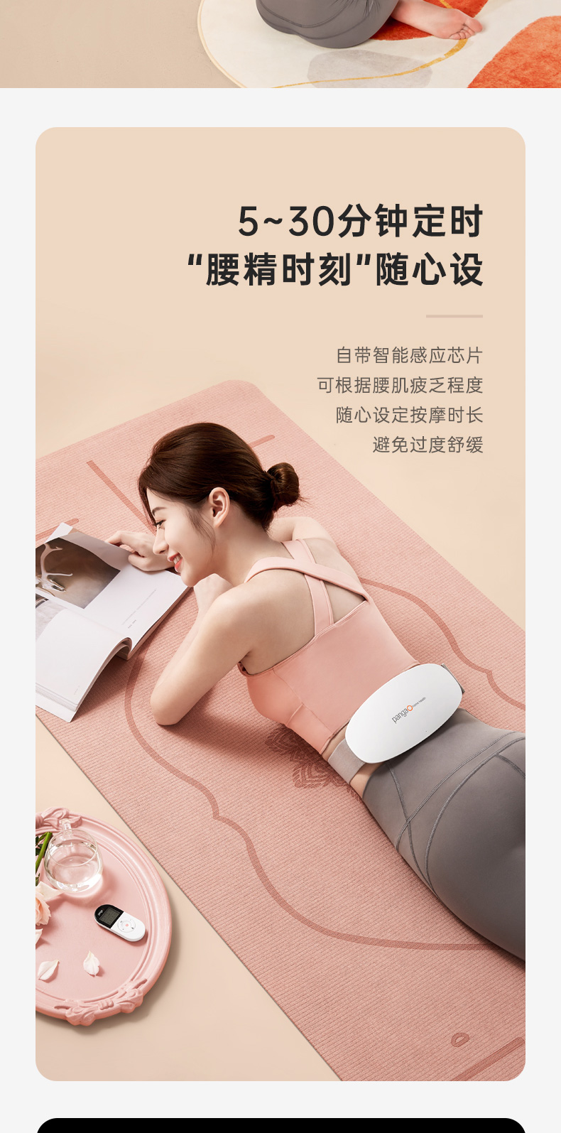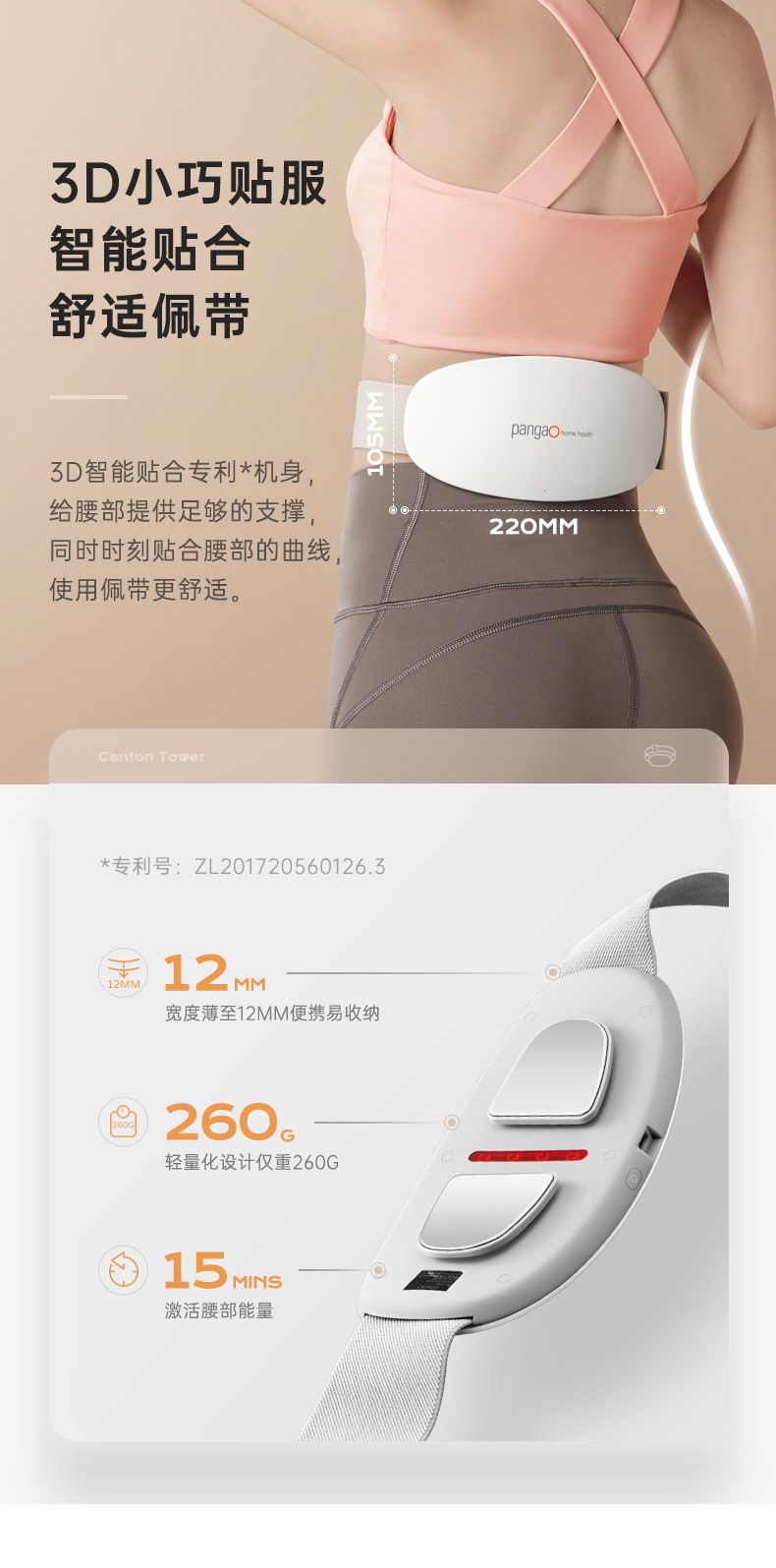 小米生态链"Pangao攀高"出品,小蛮腰款 PG-2643 智能腰部按摩仪,腰腹两用,每天按摩十五分钟,防止腰肌劳损,非常适合久坐人群。