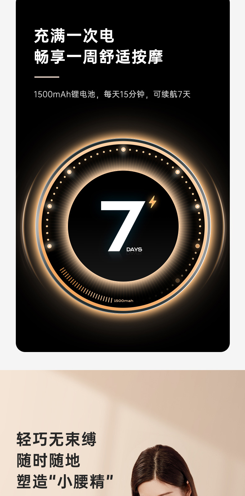 模拟真人按摩 16档可调,红光+脉冲+热敷同步作用效果加倍。人体工程学设计,精致美观,12mm纤薄机身仅有260g,贴合腰腹部曲线,可调节腰带魔术贴贴合,轻盈舒适,长时间佩戴也无压迫感。内置1500mAh锂电池,续航持久。