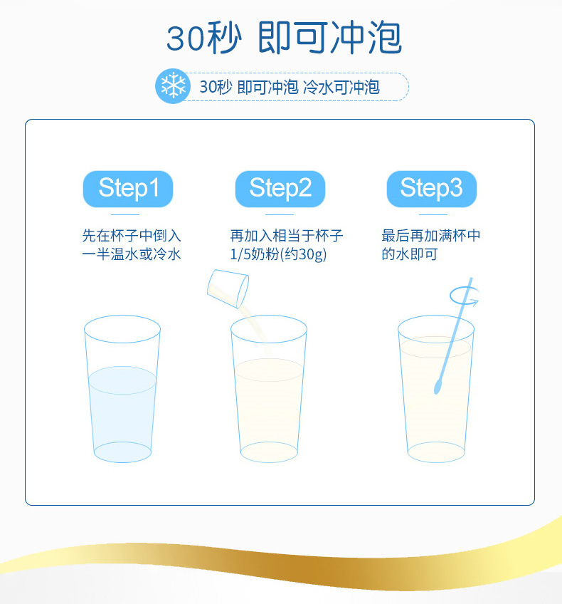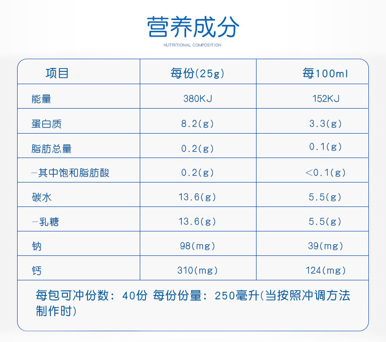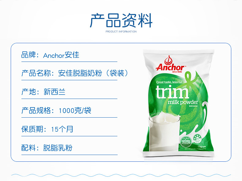 这款安佳 脱脂奶粉,每100ml仅含脂肪0.1g,约是全脂的3%,热量减少约42.68%;脱脂不脱钙,每100ml钙含量约是3.3g,均衡营养,非常适合减肥期间人群饮用。30秒速溶,不结块易冲泡 ,按250ml一杯冲泡,可冲泡40杯。除了直接饮用外,还可冲调咖啡、麦片、奶茶、制作冰激淋等。