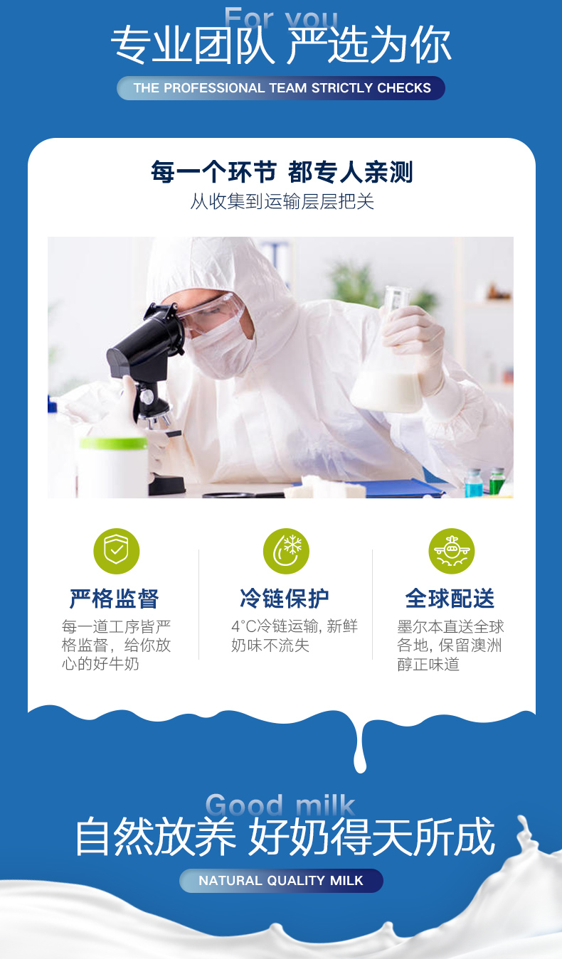 澳洲原装进口,内含丰富的钙含量和维生素,帮助补充每日所需营养,无添加,更纯真,每一滴都是健康牛奶,浓郁奶香,口口顺滑。
