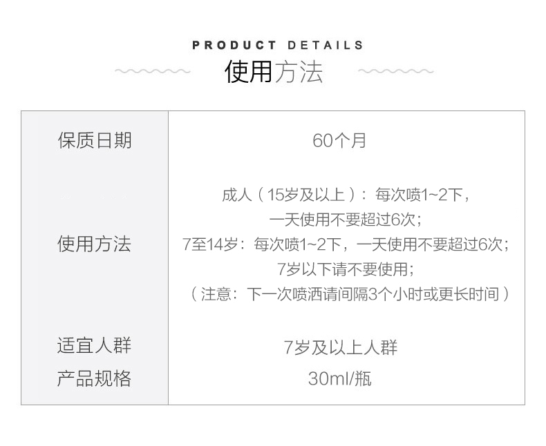 适合7岁以上人群即可使用,用的时候按着喷头对着鼻子喷两下即可,不严重的话应急喷一下就够了。每日向鼻腔内喷雾使用的次数不要超过6次,每次使用间隔3小时以上。