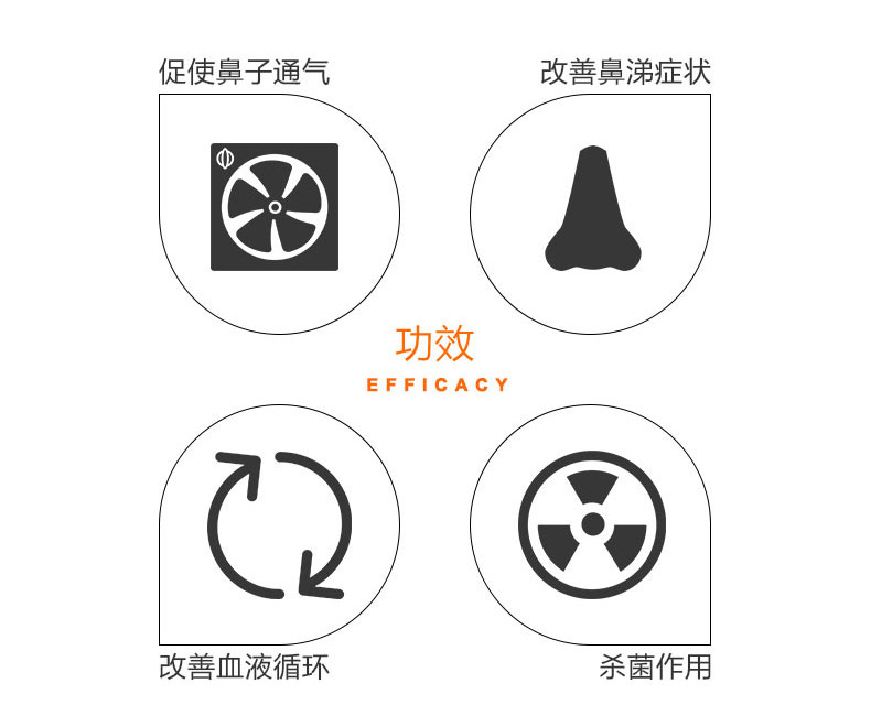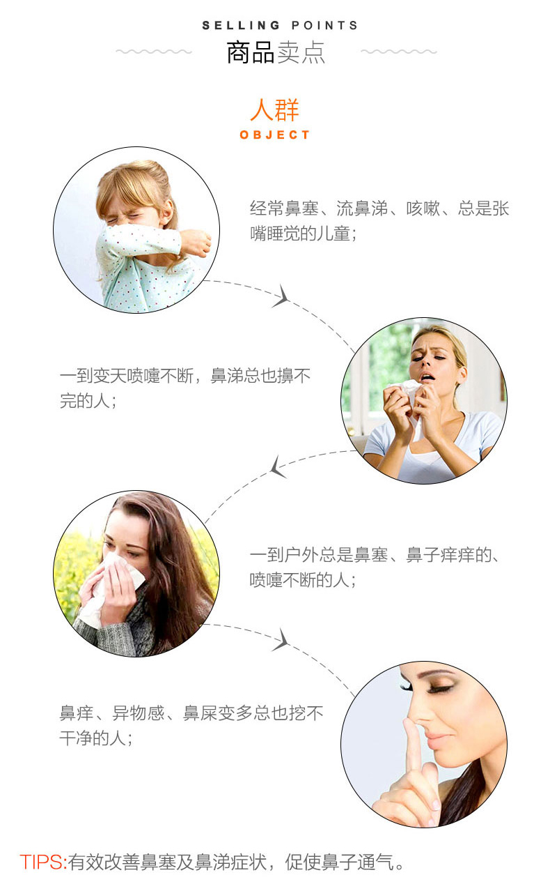 适应症:缓解因花粉过敏症、过敏性鼻炎,急性鼻炎、鼻窦炎引起的鼻塞、流涕、喷嚏等,缓解鼻塞促进鼻子通气。
