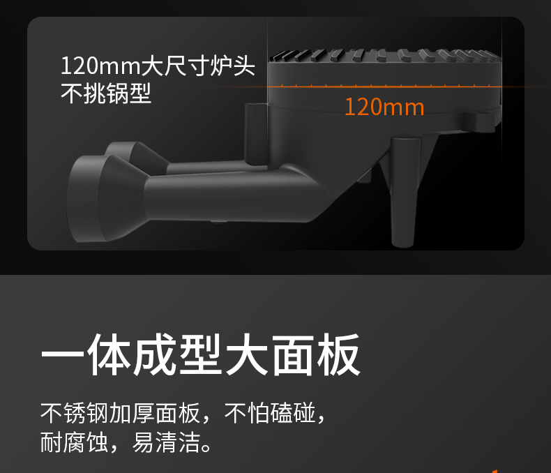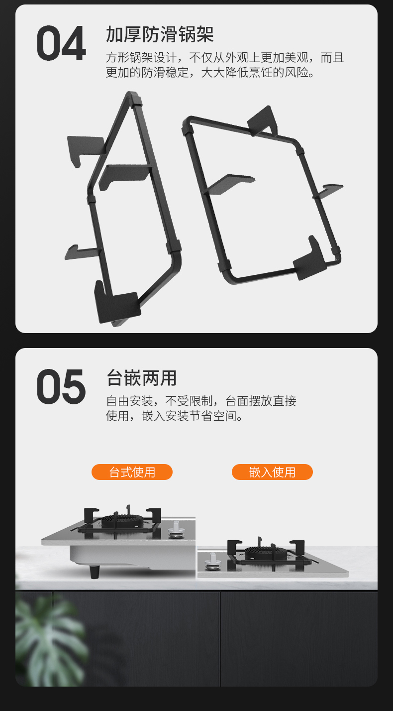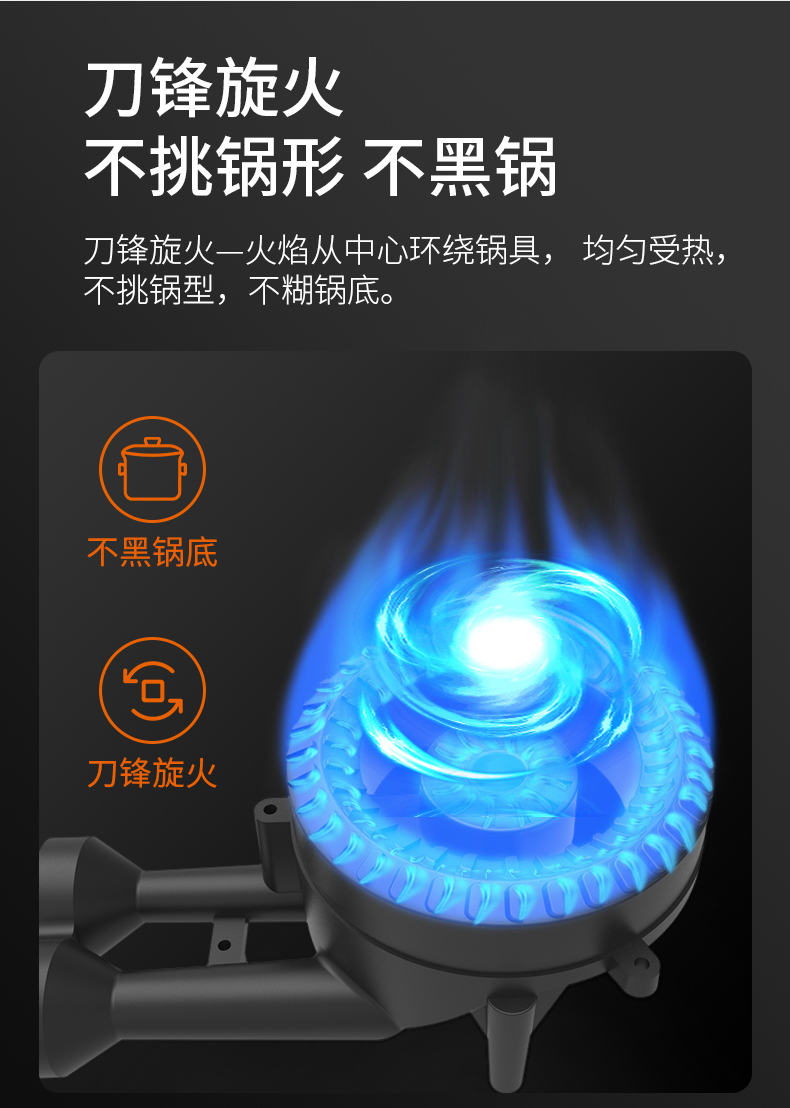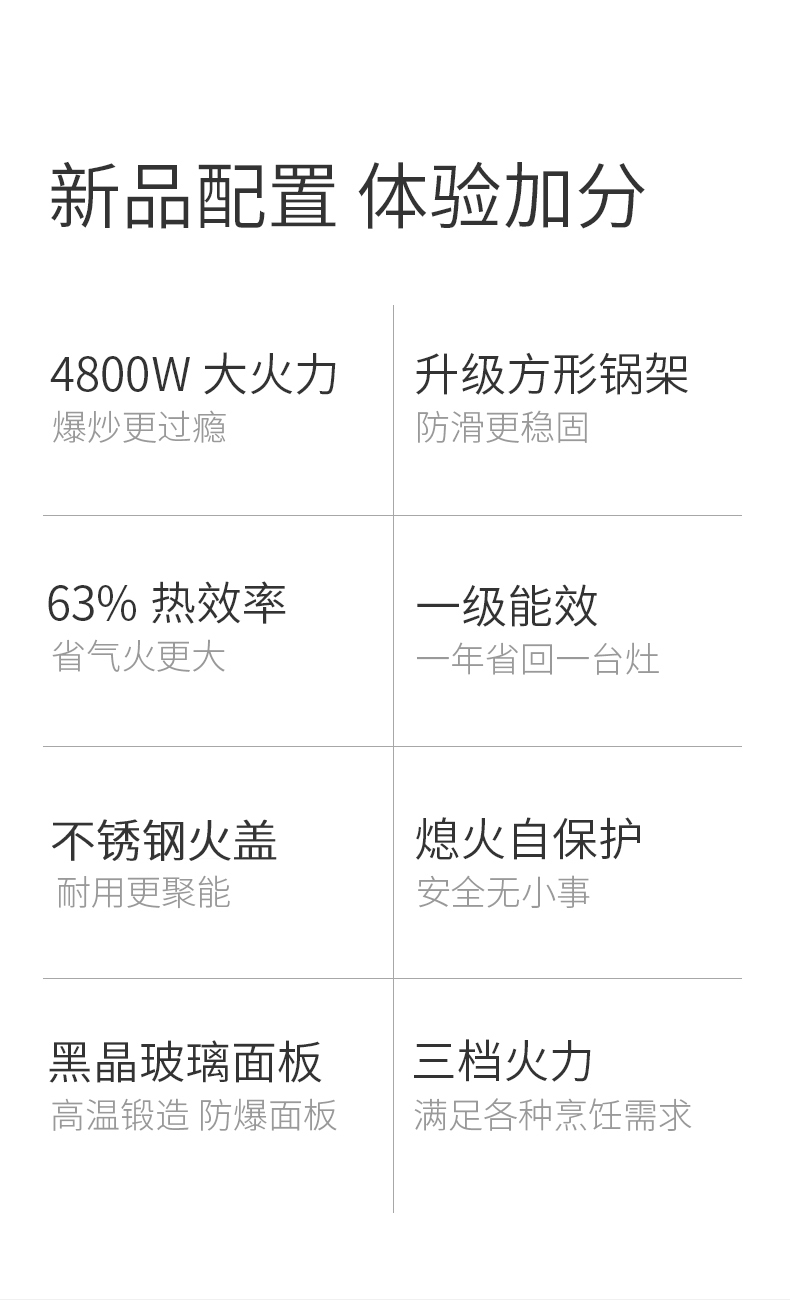 炉灶整体采用钢化玻璃+防爆油墨层+防爆膜,三层防爆防裂,耐腐蚀易清洁。采用猛火均喷燃烧系统,火力更稳更强,均匀加热无盲区,热效率高。精细的火力调节系统,火控精准。采用热敏感探头时刻检测燃烧状态,熄火自动切断燃气,避免安全隐患,使用更安全。