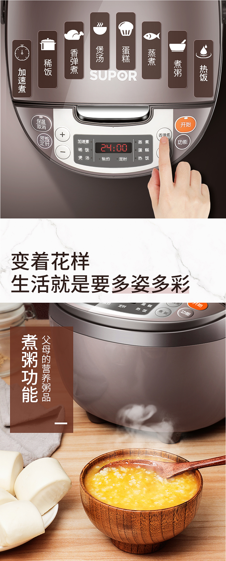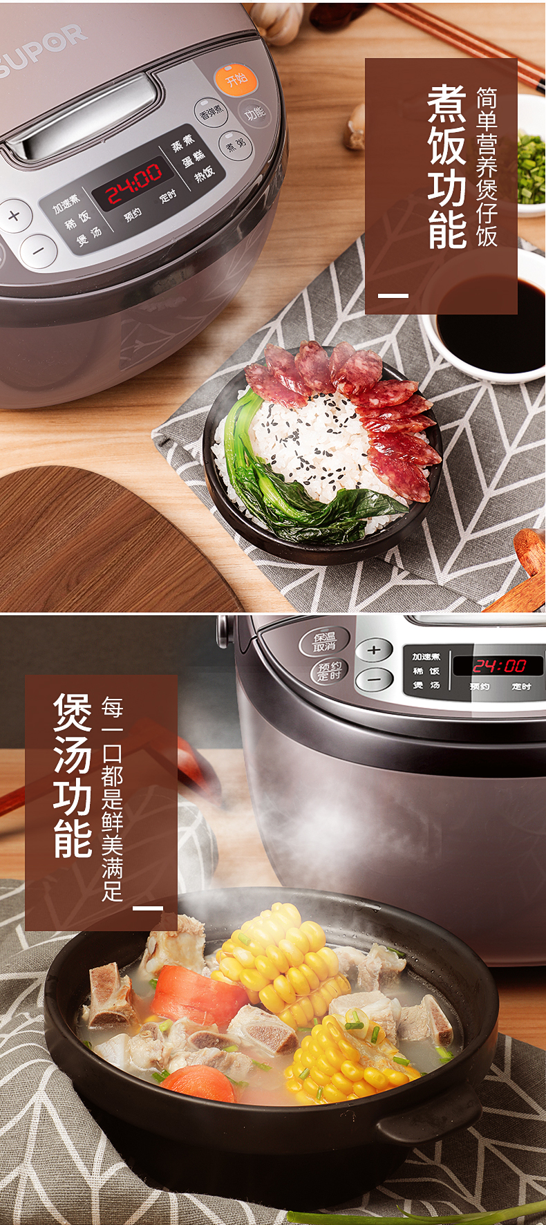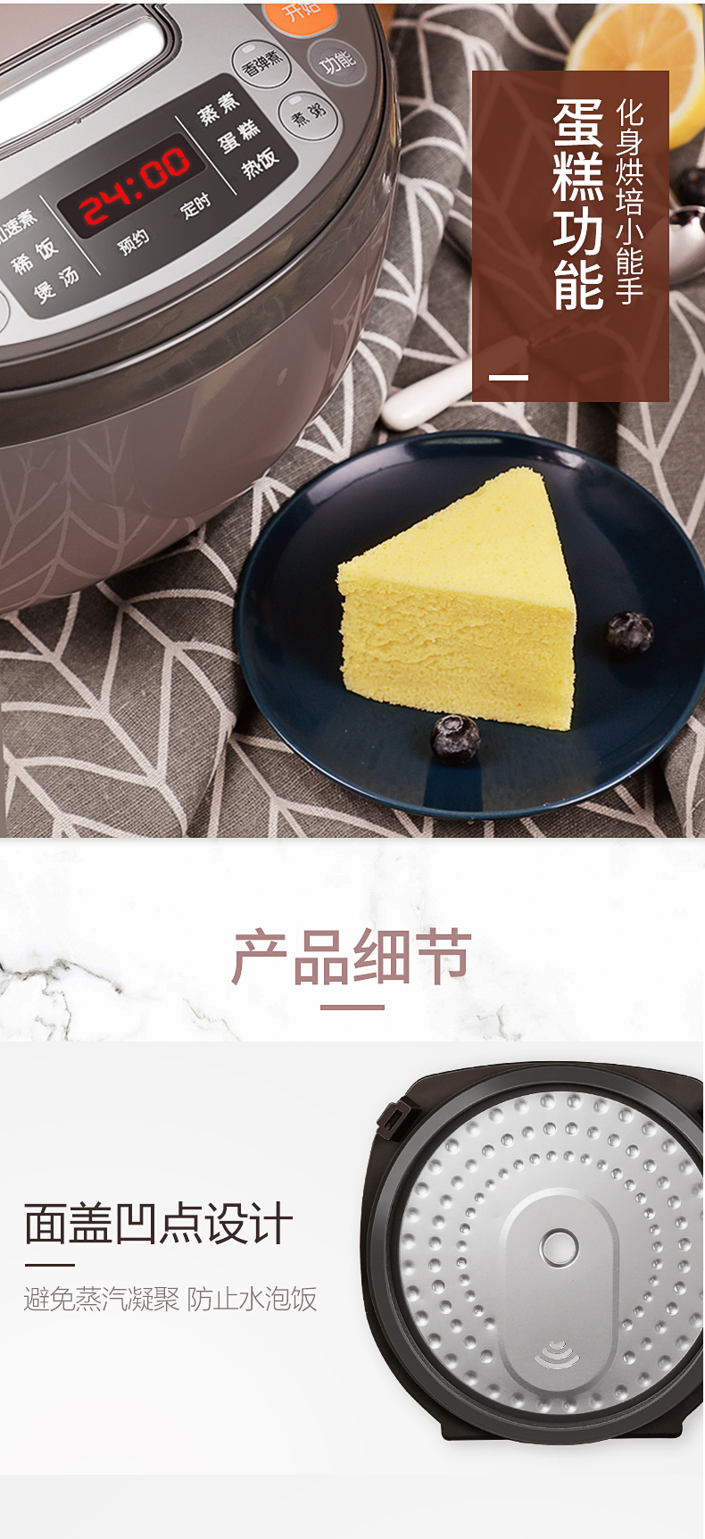 微电脑智能操控,可24小时预约定时,多种功能菜单,可用来蒸饭、煮粥、煲汤、蛋糕等,满足多种需求;3L容量,适合2-6人,不沾内胆,可拆卸微压阀,清洗简单,带把手,移动便携。领券链接点此