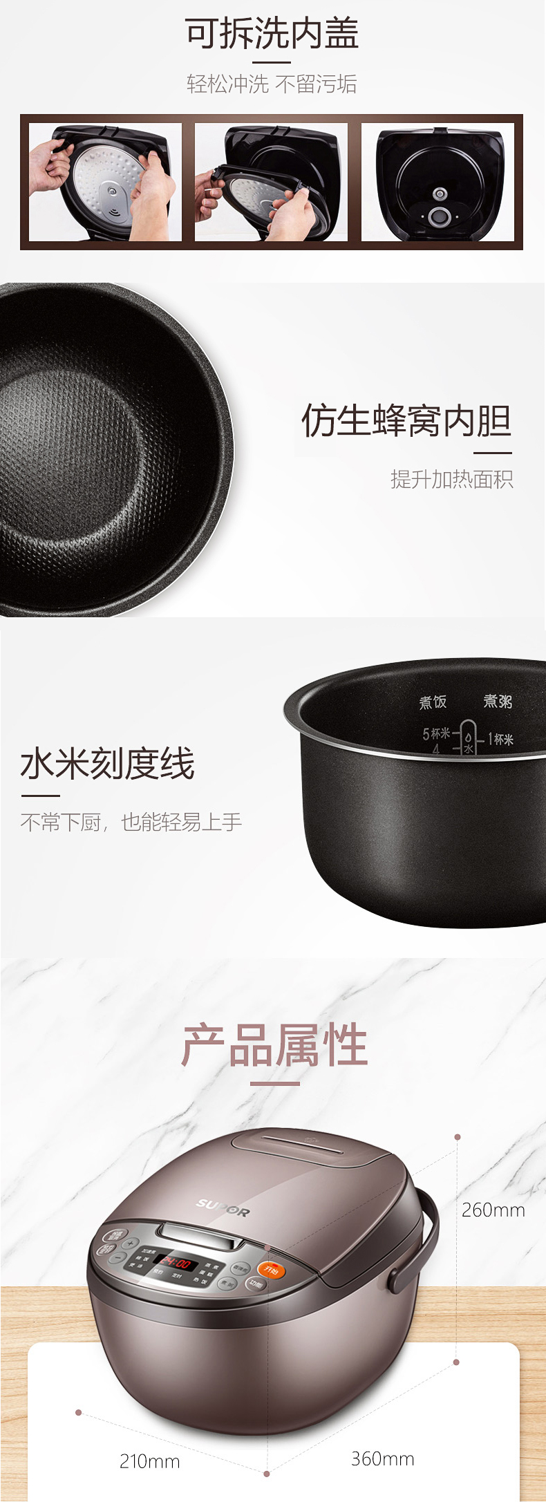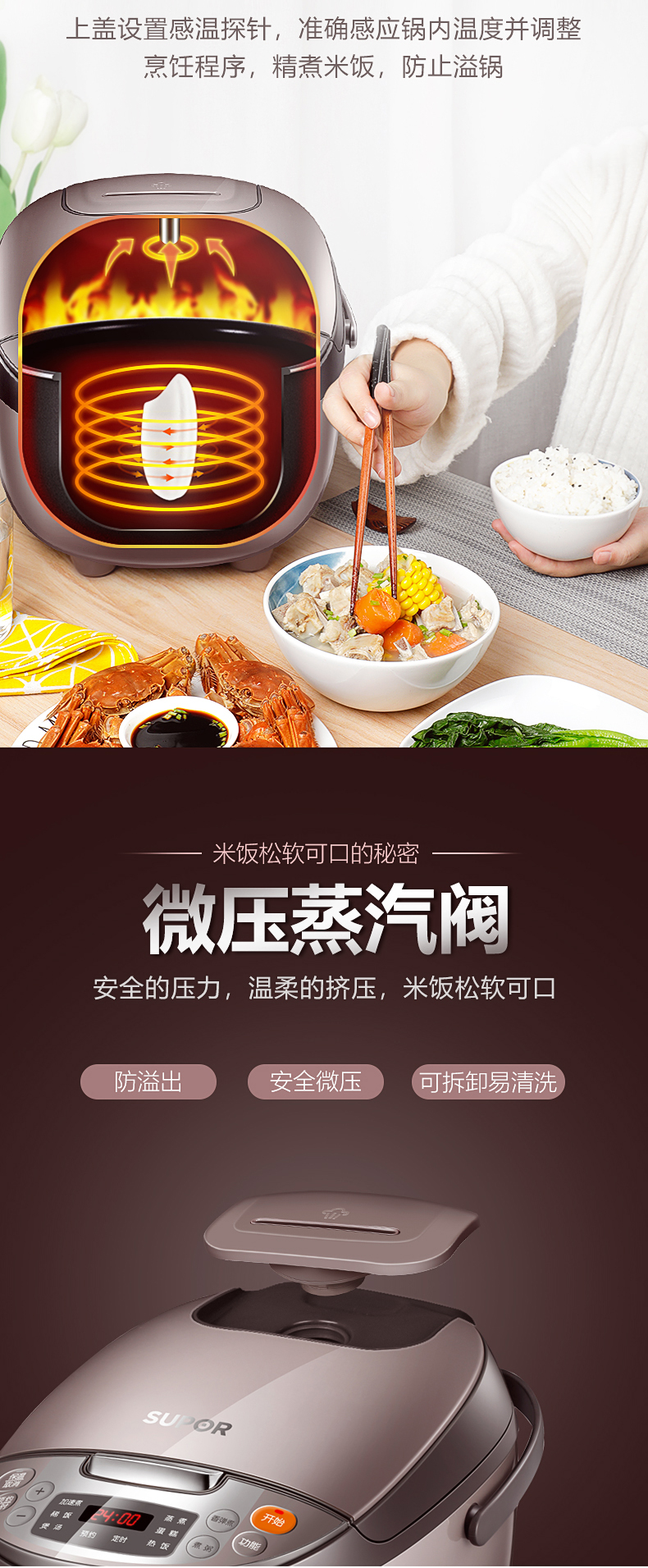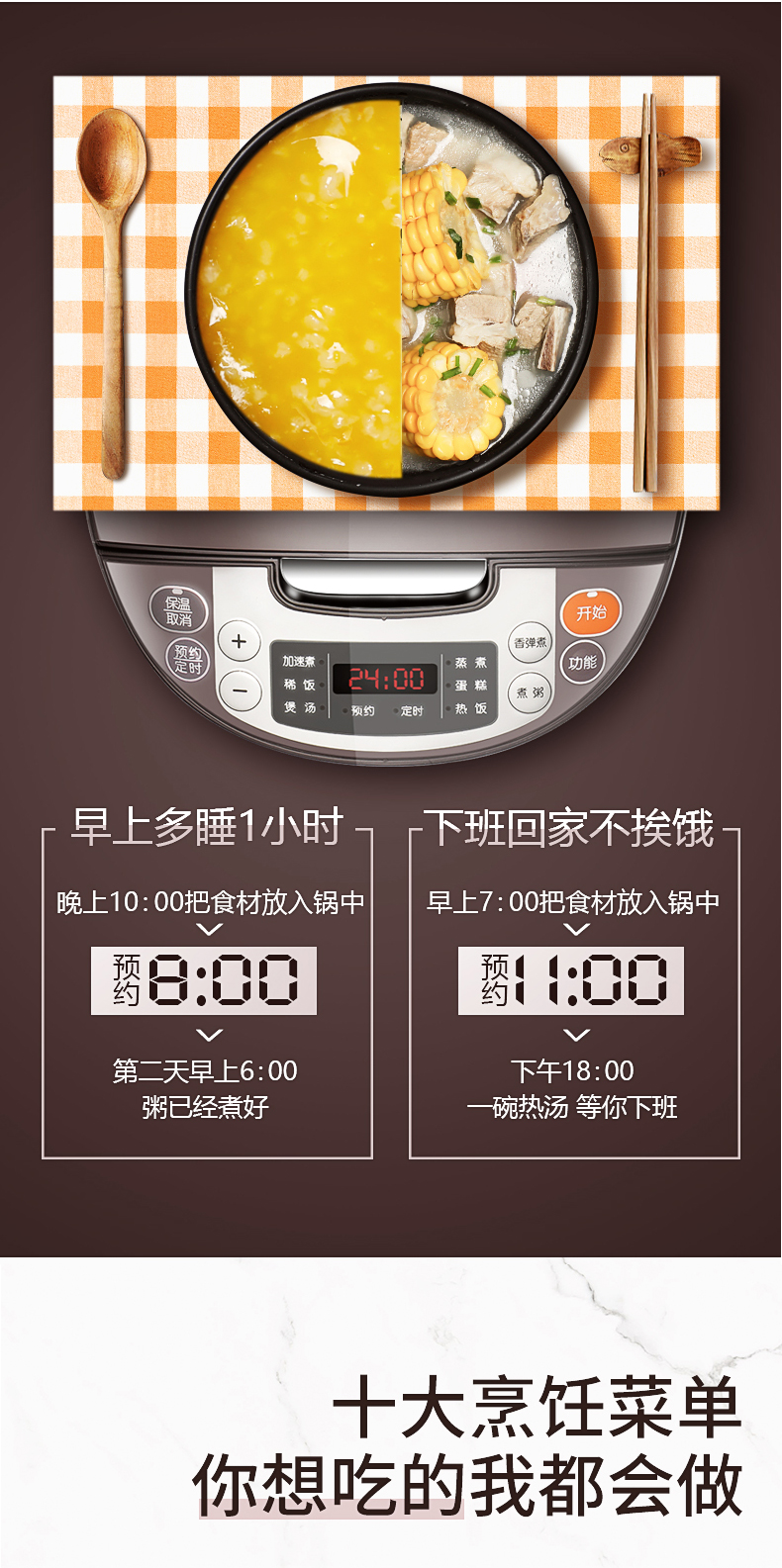 微电脑智能操控,可24小时预约定时,多种功能菜单,可用来蒸饭、煮粥、煲汤、蛋糕等,满足多种需求;3L容量,适合2-6人,不沾内胆,可拆卸微压阀,清洗简单,带把手,移动便携。领券链接点此