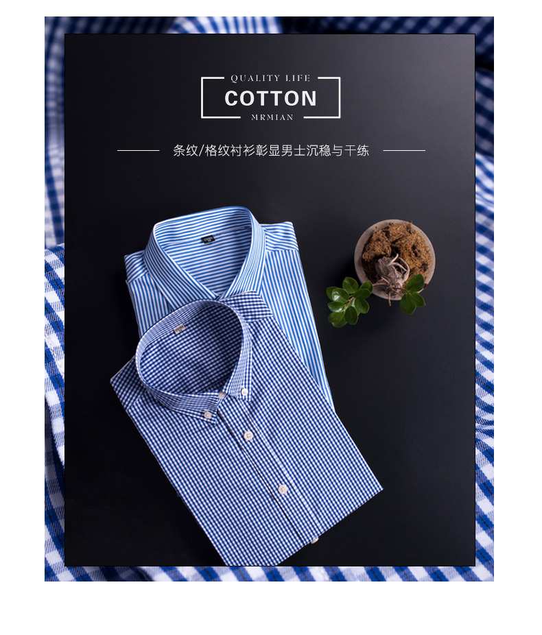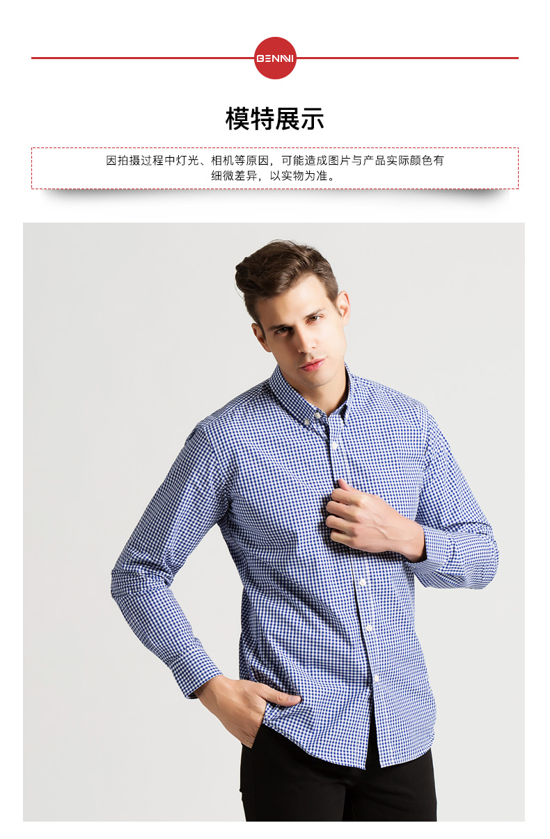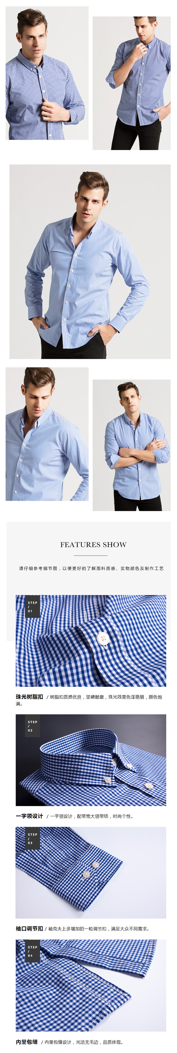 在款式上,合身版型,在商务中融入了时尚元素,蓝白格纹款式。平纹格纹横竖相交,经典时尚的同时更加增添一丝复古感觉,格子间距适中,打破了传统商务衬衫的刻板局限,表面呈现更加立方体别致。