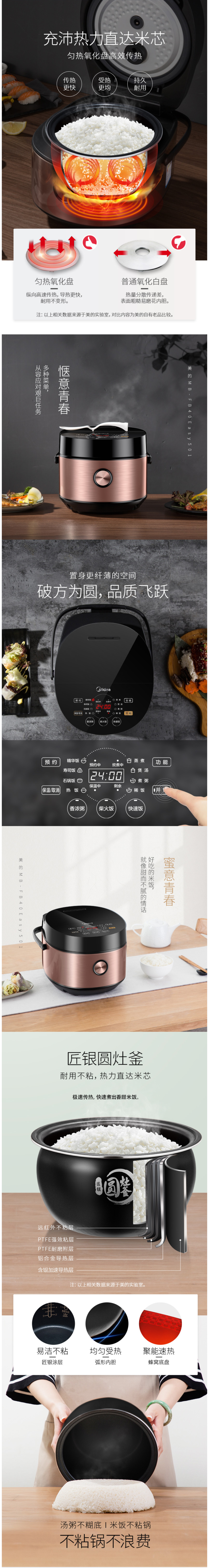 这款美的 全智能多功能电饭煲,容量是4L,适合3~7口之家使用。 拥有沸腾芯,阶梯式结构高效破泡防溢,可以保持持久沸腾不溢出,让米粒充分受热。同时0.3Kpa的为微压,使得煮出来的米饭味道更香。