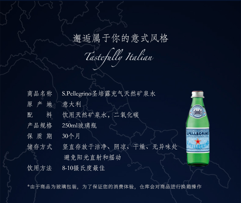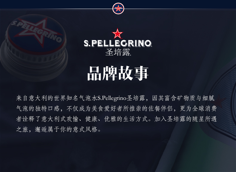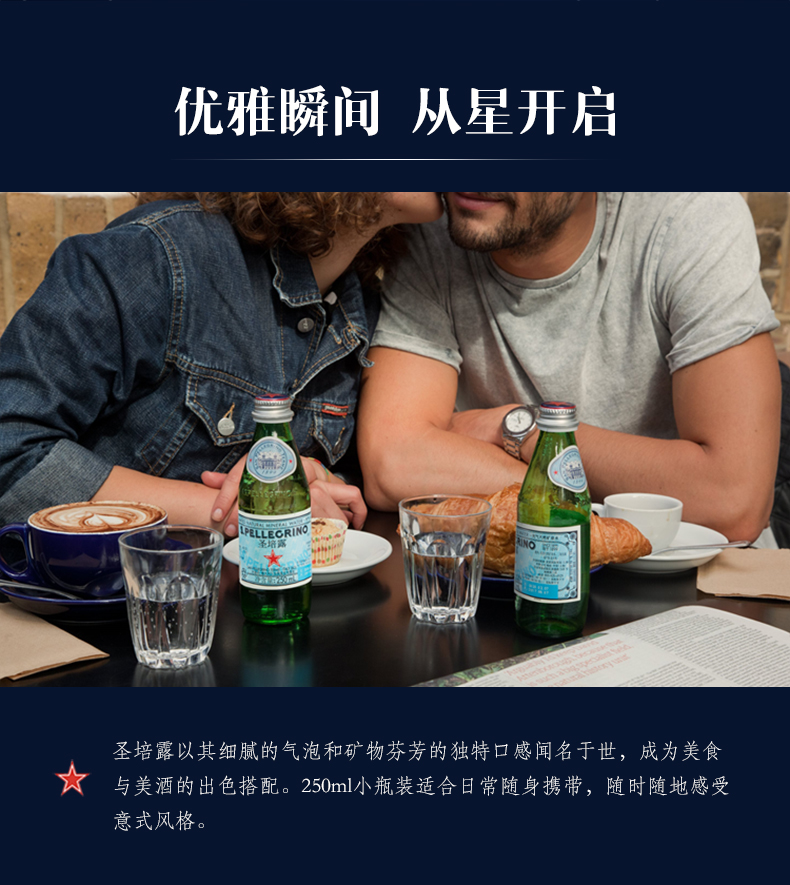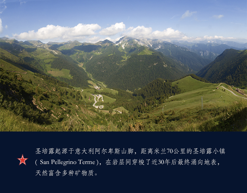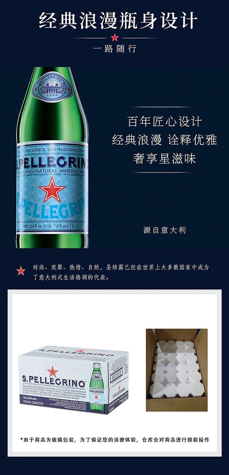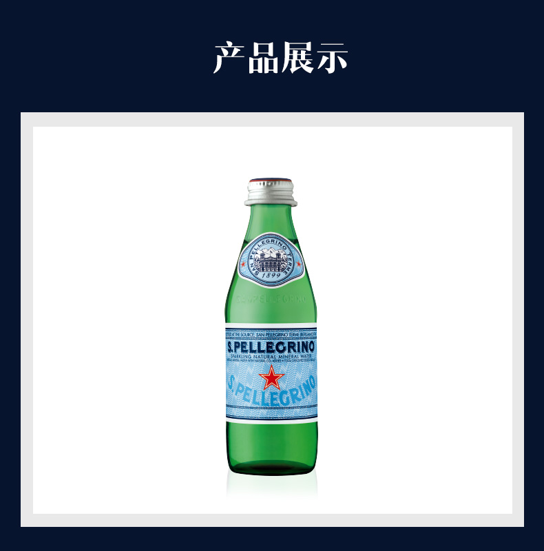 S.Pellegrino圣培露作为世界高端矿泉水之一历史悠久,意大利顶级“佐餐水”,产自阿尔卑斯山区。商家的官方介绍的卖点是“独特的小气泡”和“微妙的矿物芬芳”且有淡淡甜味(小编舌头虽然灵活但觉得含气矿泉水差别主要是气多少...)。常见于各国顶级餐厅,用来佐餐可以在吃过一道菜后更好地体会下道菜肴的美味,据说特有的矿物质与各种葡萄酒也是相得益彰,至于怎么相得益彰的小编就不太清楚了,各种矿物质的含量及比例是否能让口感独特大家可以自己体会。