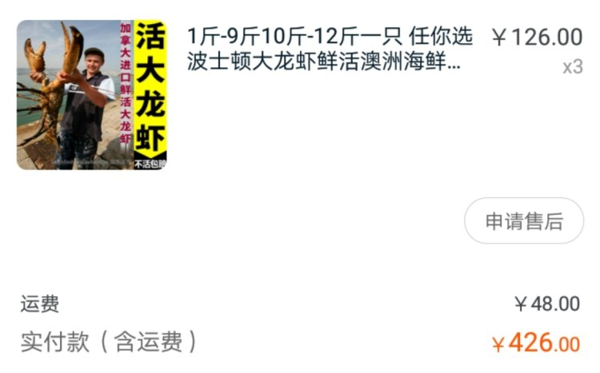 小编之前在另一家买过鲜活波士顿龙虾,单价是126/斤,拍了3斤加上邮费426元,价格还是比线下超市划算,龙虾到家还活着,据父母说味道不错,蒜蓉清蒸很鲜美。