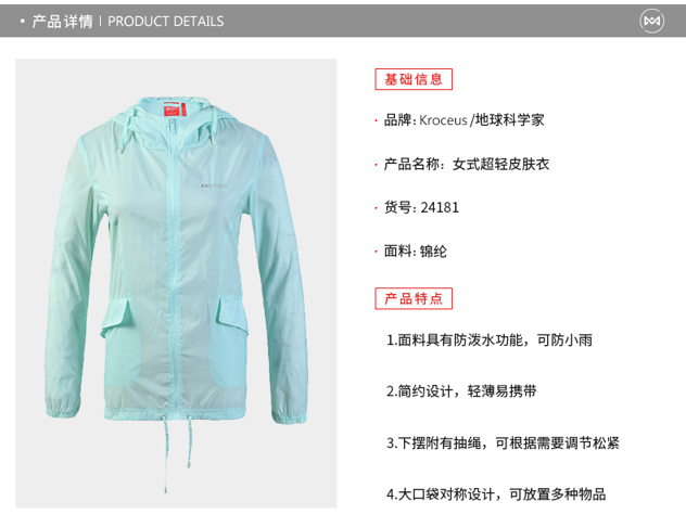 这款地球科学家女皮肤风衣,采用的靠谱的超细尼龙材质,摸起来手感柔软,可防风、轻度防泼水,高度透气,还支持UV防晒,可收纳便于携带。