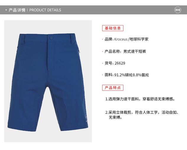 这款地球科学家 男速干透气休闲短裤,使用91.2%锦纶+8.8%氨纶的混纺面料,主打耐磨和速干,出汗之后也不贴身,能够保持身体干爽。混入氨纶提高了裤子的弹性,上下左右四个方向都有弹力,上身灵活束缚感小。