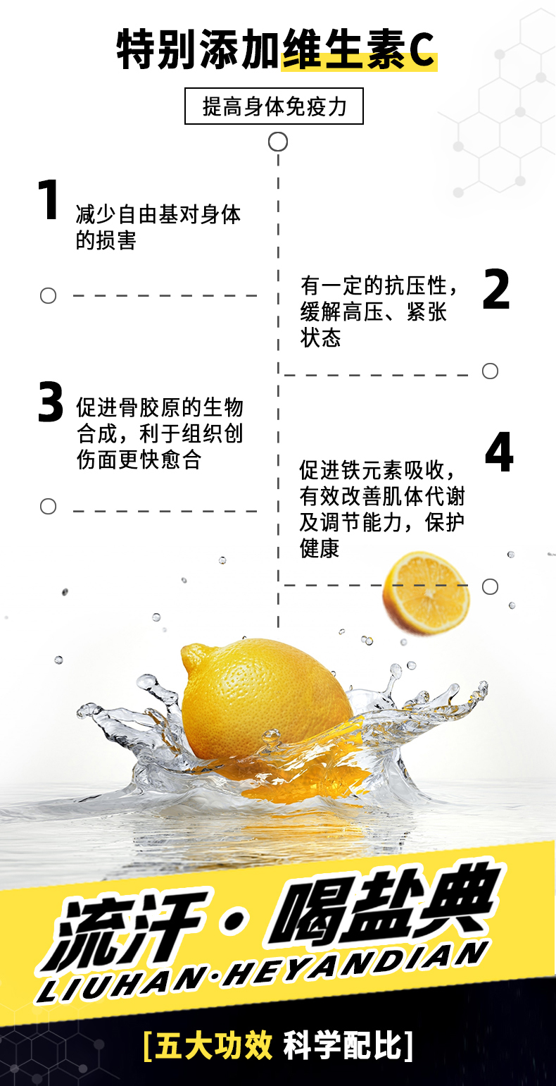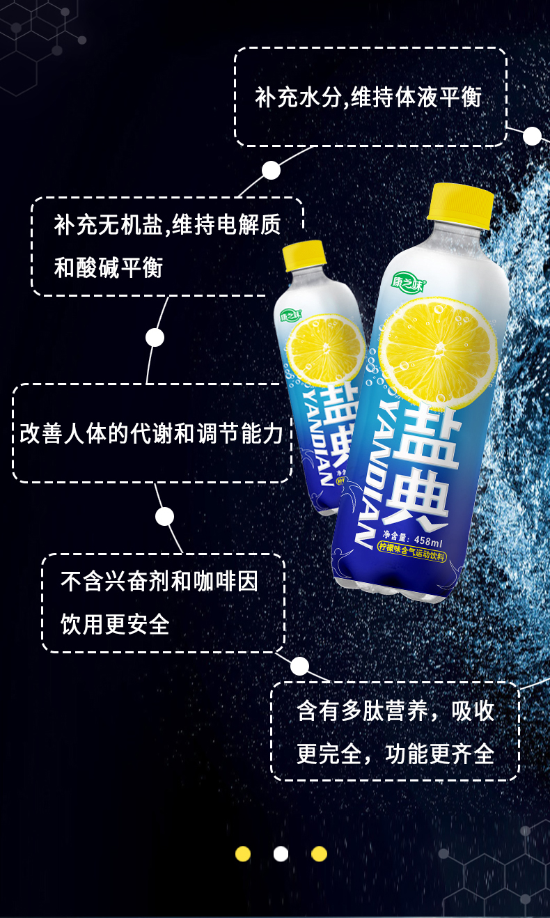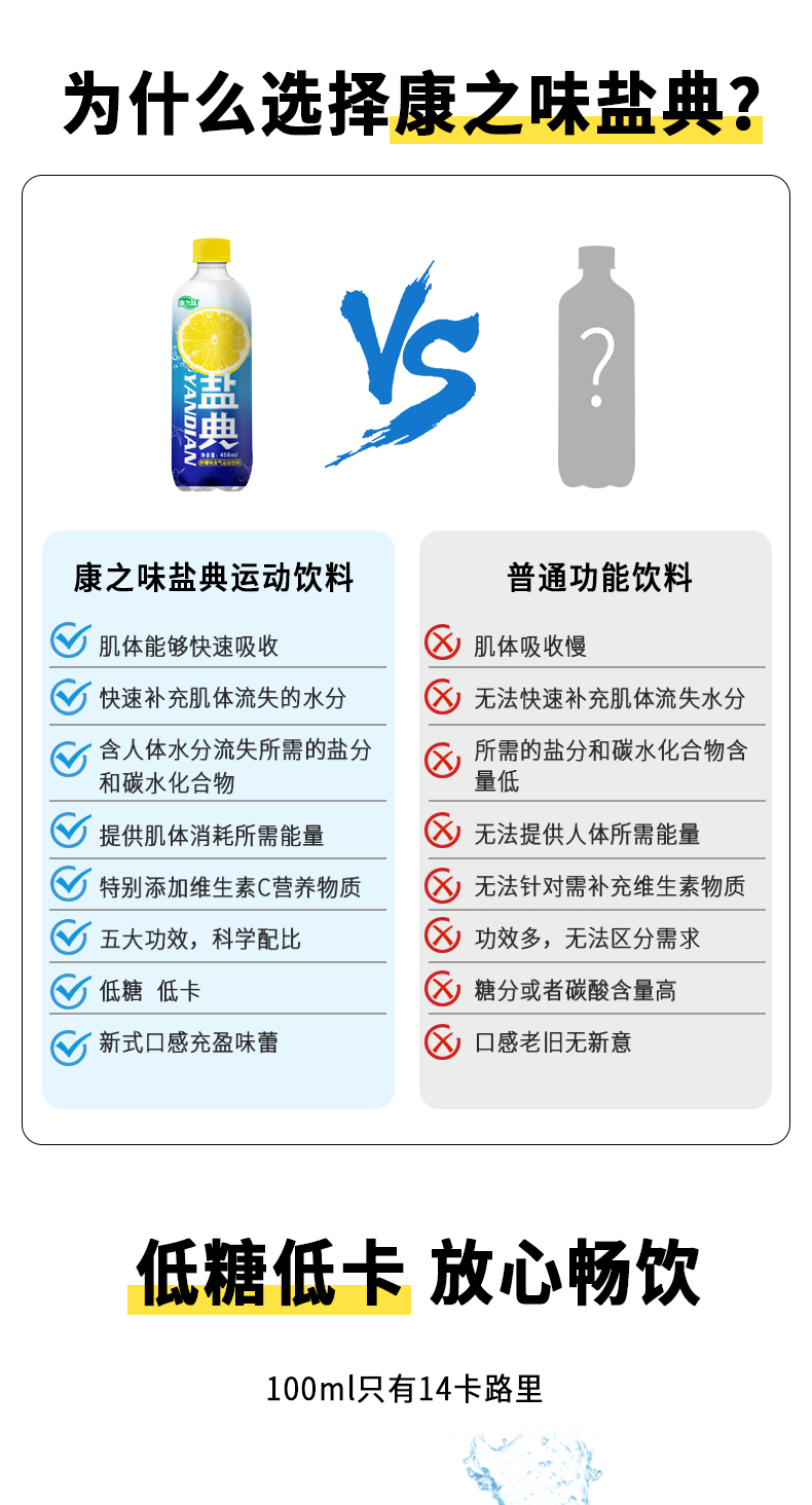 盐典除了跟一般的饮料一样,含有水分和糖分外,还含有无机盐和维生素,能够及时补充无机盐,维持电解质和酸碱平衡;合适的钾、钠离子含量符合国家运动饮料添加范围,既不会达不到补充效果,也不会增加饮料的渗透压。
