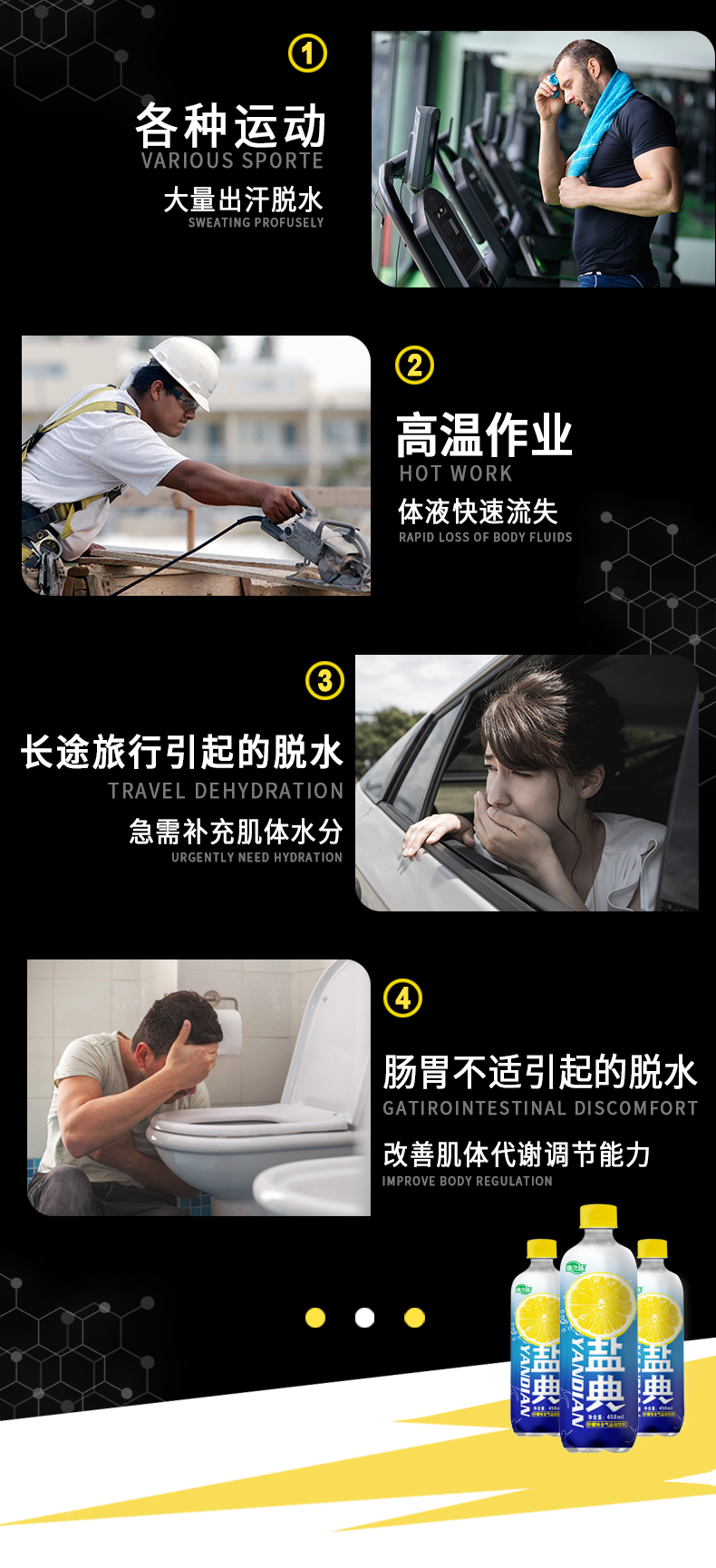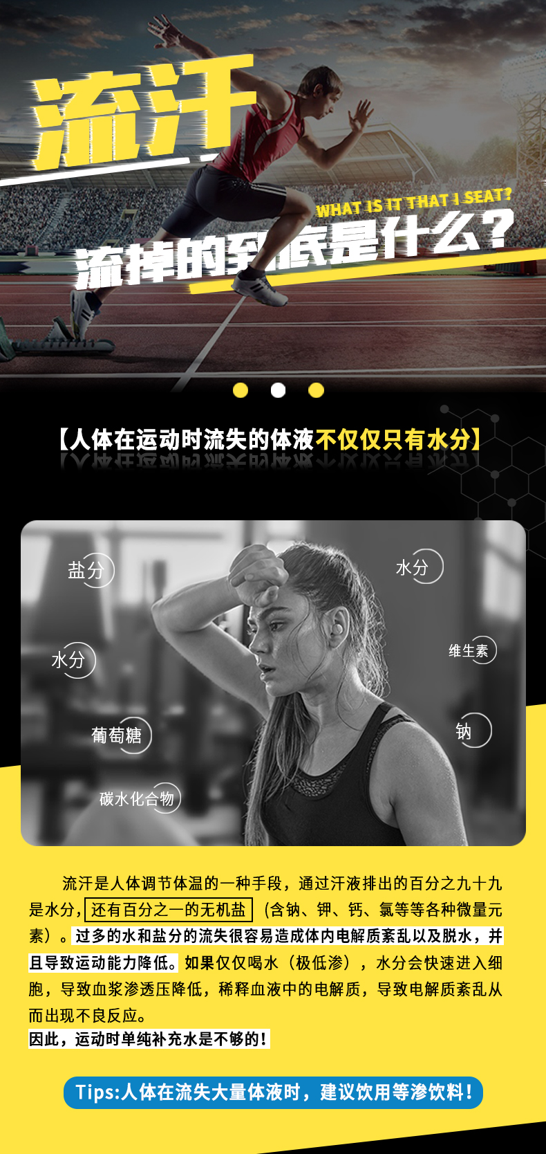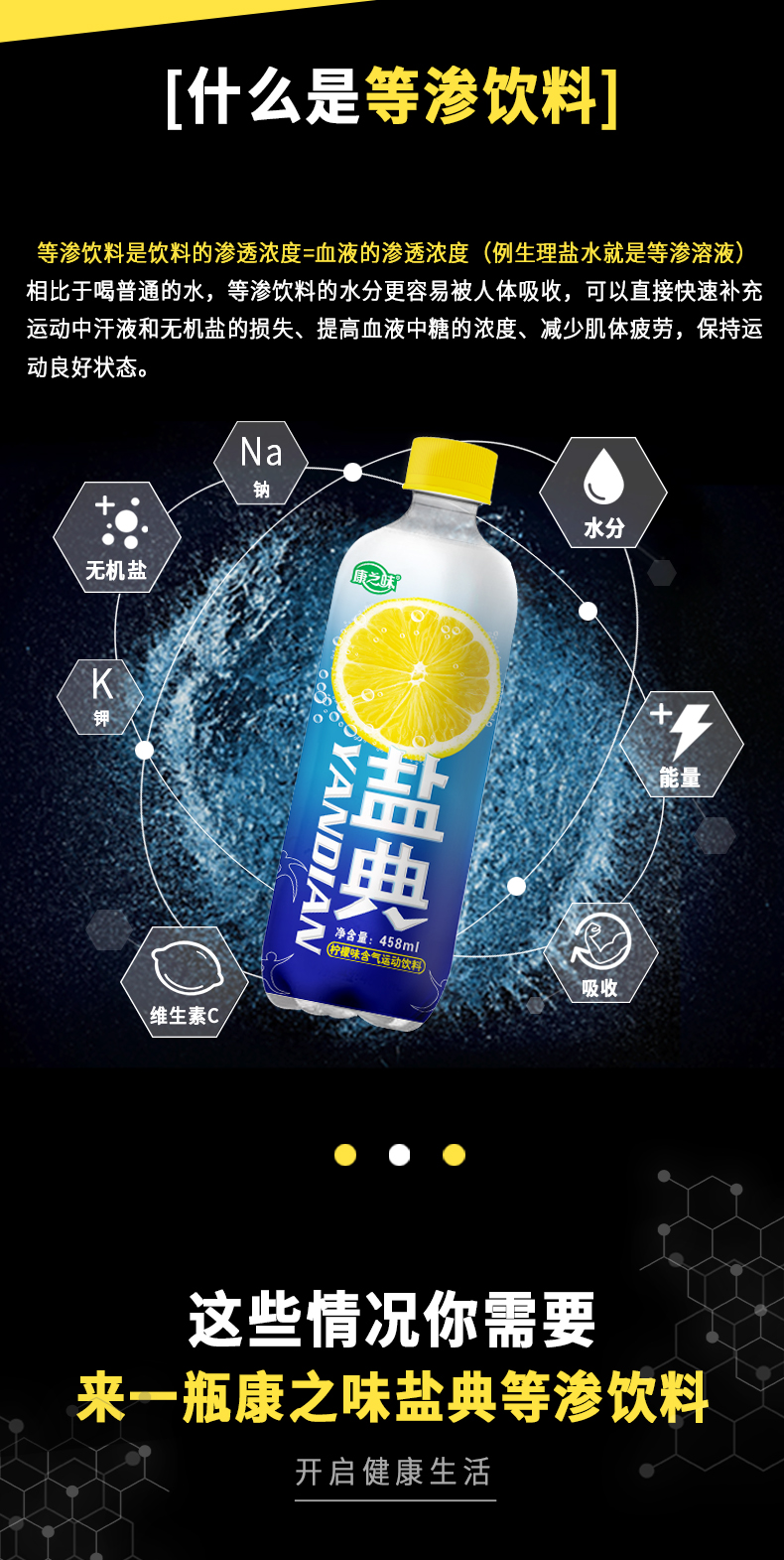 盐典除了跟一般的饮料一样,含有水分和糖分外,还含有无机盐和维生素,能够及时补充无机盐,维持电解质和酸碱平衡;合适的钾、钠离子含量符合国家运动饮料添加范围,既不会达不到补充效果,也不会增加饮料的渗透压。