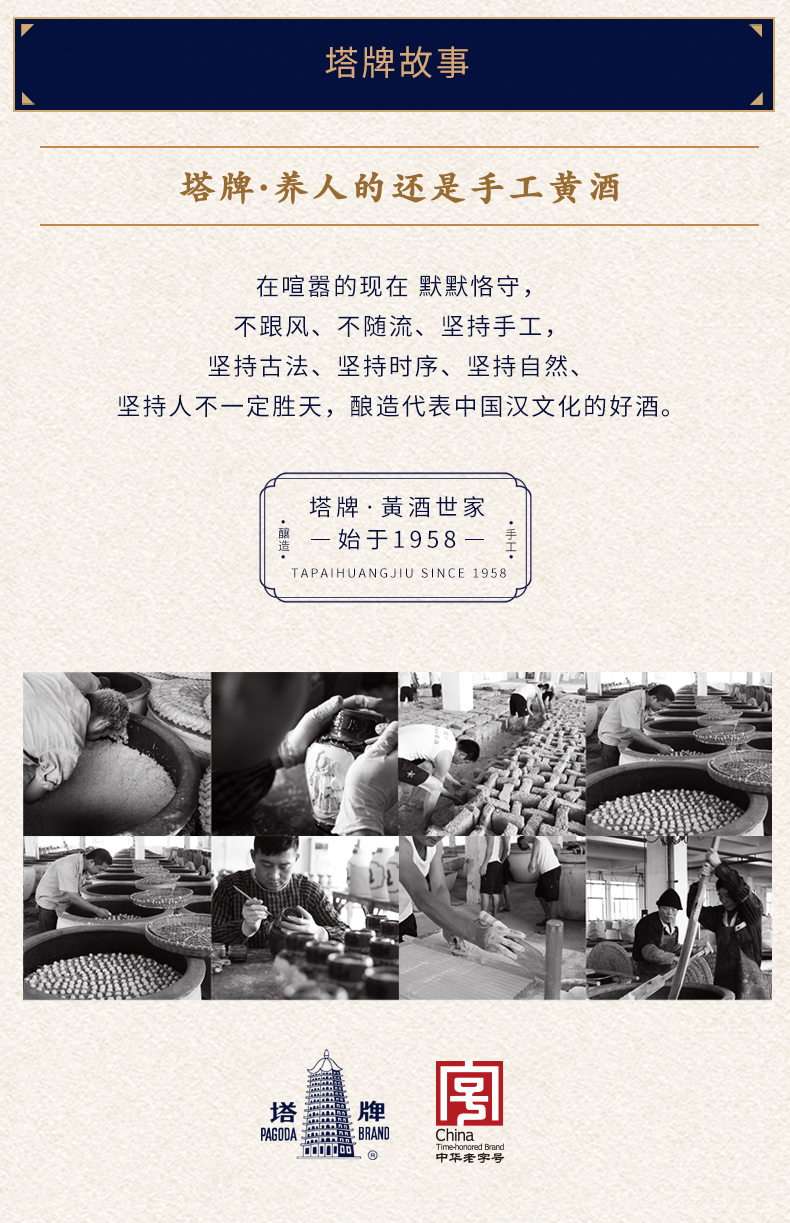 塔牌黄酒顺应自然一冬一酿,由国家非物质文化遗产绍兴黄酒传统酿制技艺传承人王阿牛大师领衔,全部采用手工酿制。酒体醇厚丰满,酒气芬芳馥郁,酒味甘鲜爽洁。塔牌黄酒自1958年进入国际市场以来,已享誉三十多个国家和地区,其出口量在绍兴黄酒企业中名列前茅,是我国绍兴酒的重要出口品牌。