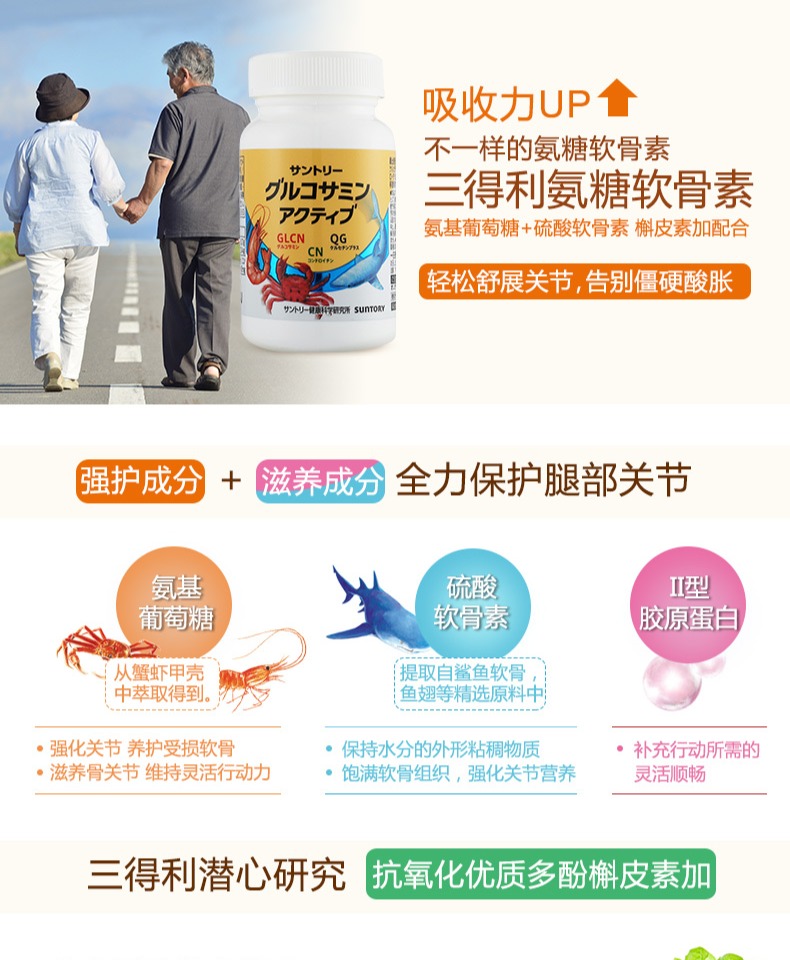 这款 日本SUNTORY 三得利 氨基葡萄糖氨糖软骨素 ,规格:375mg*180粒,采用蟹虾甲提取的氨糖葡萄糖+鲨鱼软骨中提取的硫酸软骨素,槲元素添加,帮助吸收,持久抗氧化,润滑关节,让软骨饱满厚实有弹性,缓解关节疼痛,恢复年轻态。领券链接点此