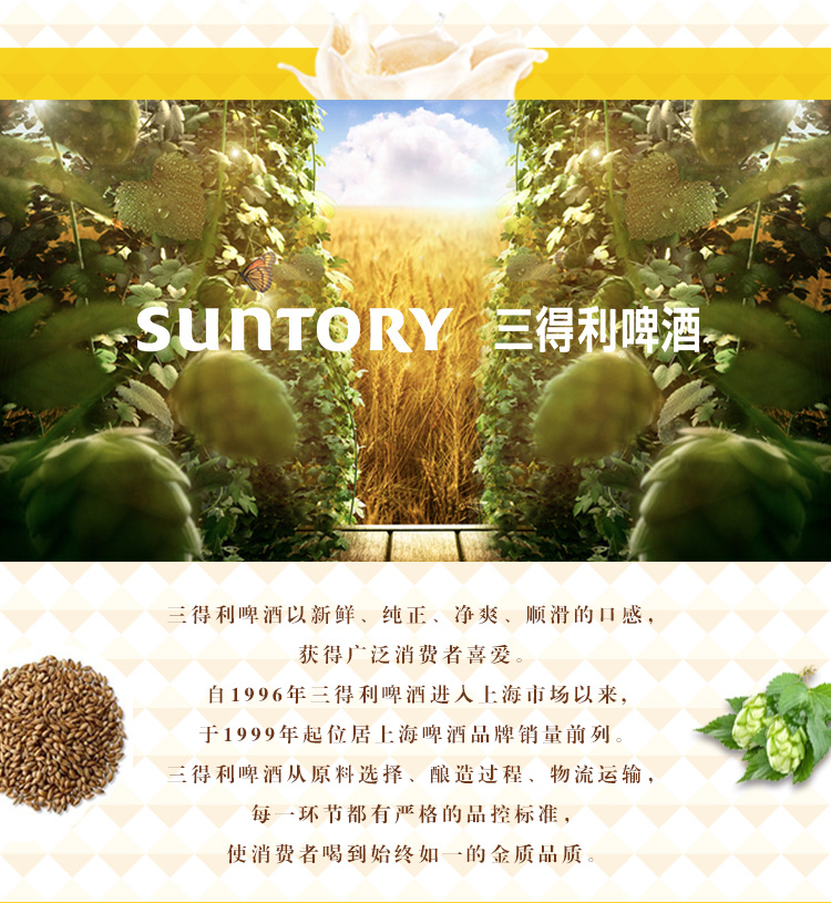 三得利啤酒精选优质二棱大麦麦芽,优质啤酒花为原料,采用日本高品质酵母发酵,从原料选择,酿造过程,物流运输,每一环节都有严格的品控标准,以新鲜、纯正、净爽、顺滑的口感,获得广泛消费者喜爱。自1996年三得利啤酒进入上海市场以来,于1999年起位居上海啤酒品牌销量前列。