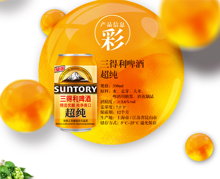 三得利著名的超纯啤酒,主打新鲜、纯正、净爽、顺滑的口感。