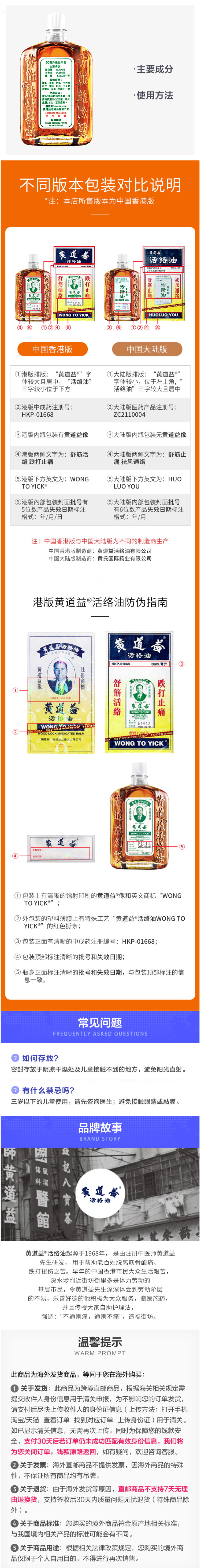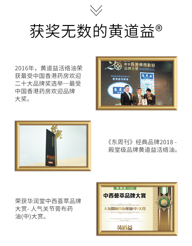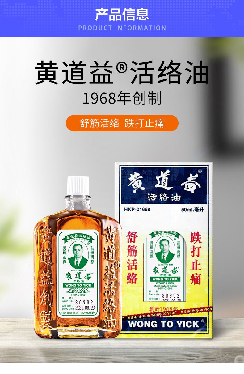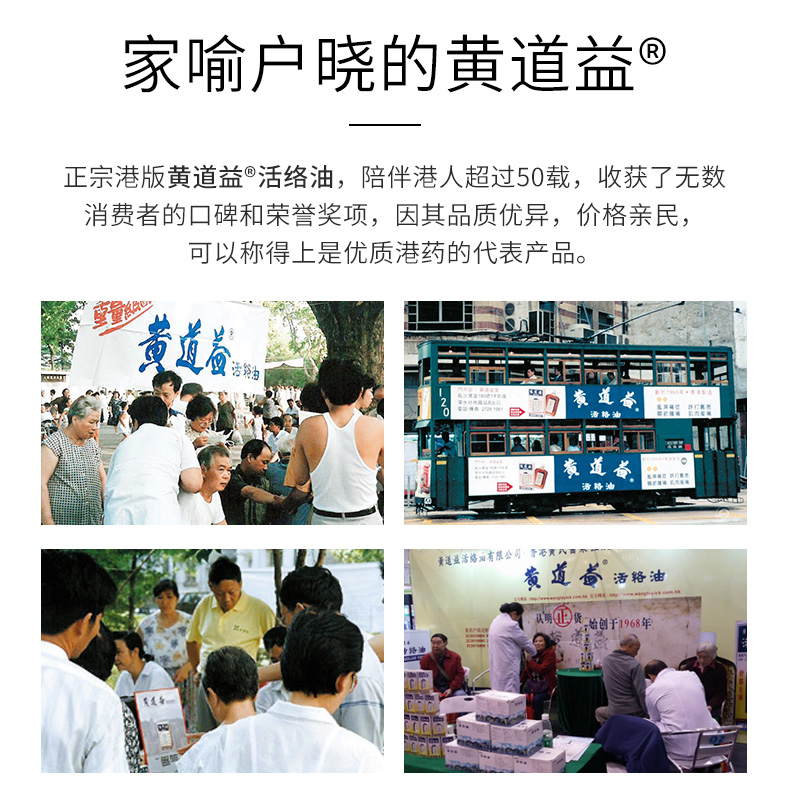黄道益活络油,是中国香港老中医黄道益医师集数十年临床经验创制的活络油,选用高质天然药料,配以止痛药材精炼而成,舒筋活络,去瘀生新,增强身体自然康复机能。缓解腰酸背痛的症状,治疗跌伤肿胀,以及头晕眼花疗效较好。