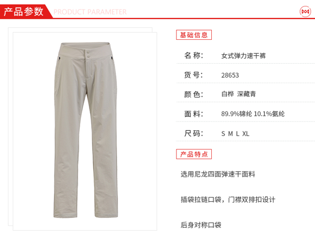 这款地球科学家 女弹力休闲透气速干裤,是2018年专柜款,使用靠谱的抗撕裂速干尼龙面料,耐磨抗撕裂不易破损。尼龙纱线呈多股中空状,中空管道快速吸水快速向四周分散,加大挥发面积达到快干,通常在雨天淋湿后不到1小时就能干。