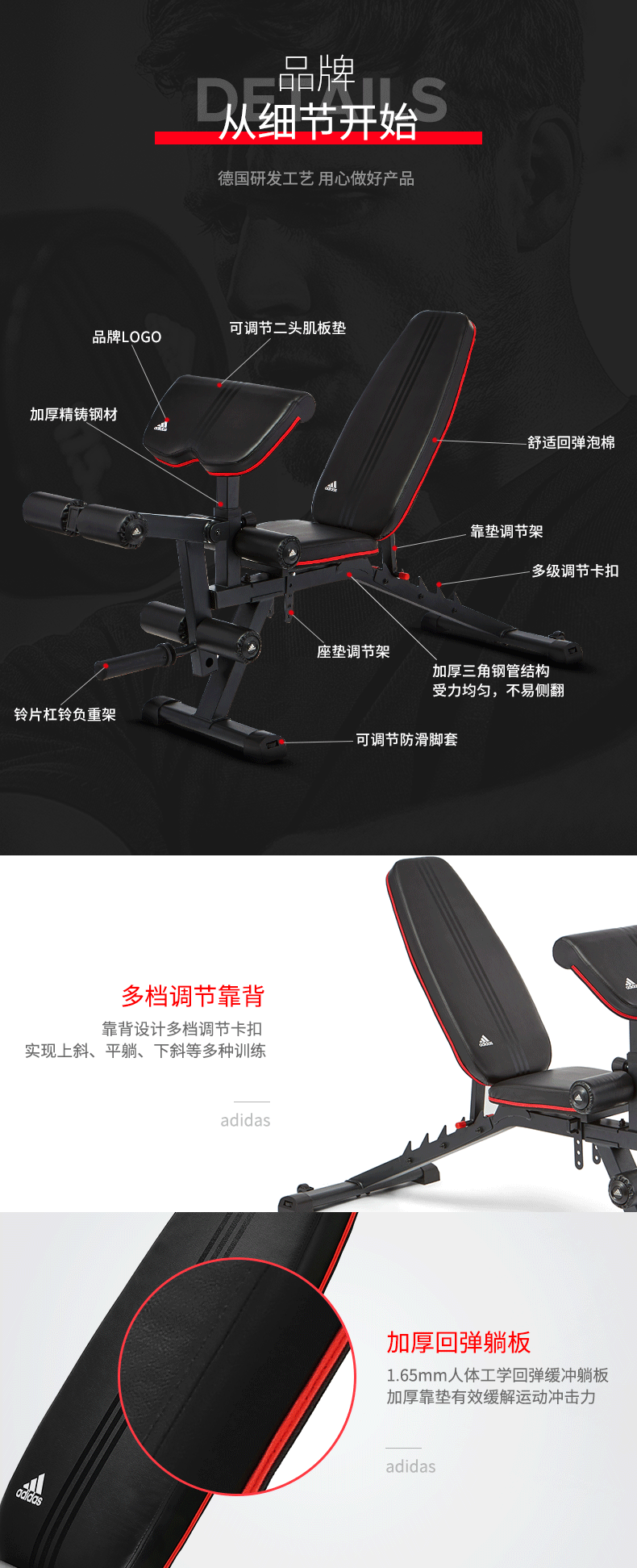 这款阿迪达斯ADBE-10238家用健身椅,是一款多功能卧推凳,配备有可调节二头肌板垫、铃片杠铃负重架、靠垫调节架、坐垫调节架,可以配合完成肱二头肌训练、背部肌群、三角肌训练、斜方肌训练、胸肌训练、腹肌训练、大腿肌群训练。