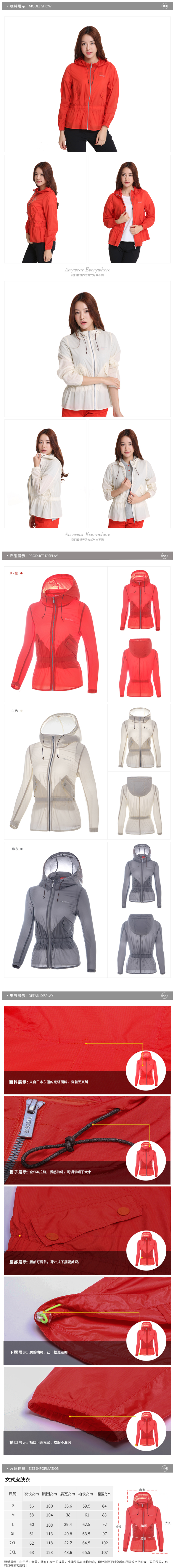 这款皮肤风衣是2016春夏款,正价是590元,现在是旧款清仓。使用日本东丽Gram Art克轻面料,是一种100%超细尼龙,强度好,防撕裂,重量轻,防风、抗污。