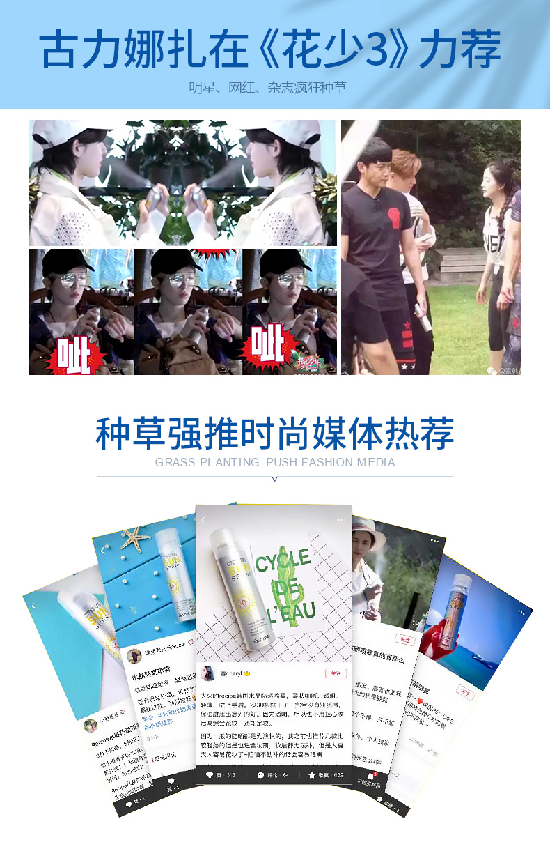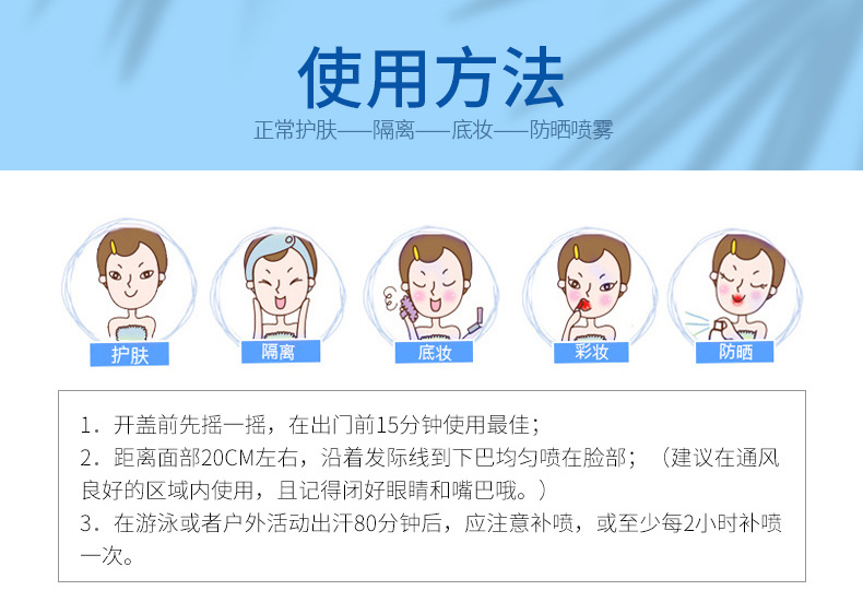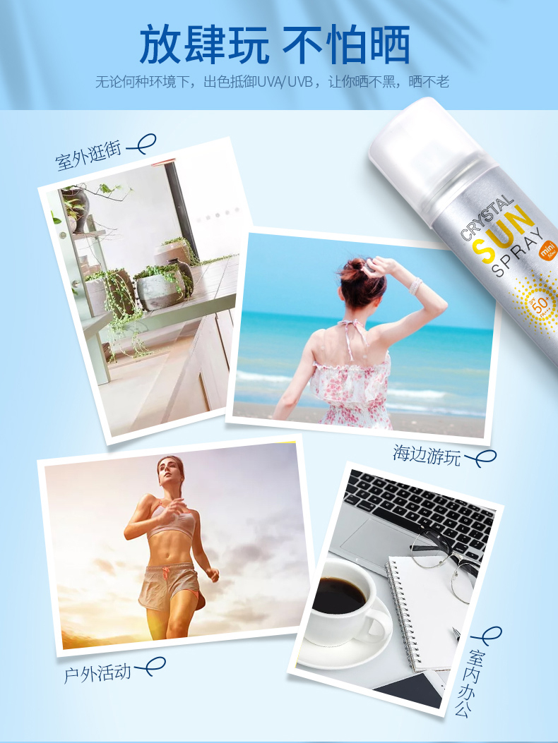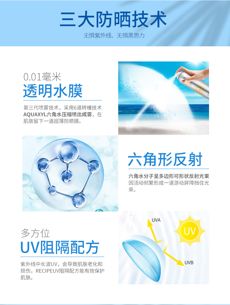 拥有高防晒指数SPF50+PA+++,是目前世界最高防晒指数,防晒时间长达12小时,有着如羽毛般轻盈的质地,丝毫没有浮白迹象,360度自由喷湿的设计,脸部及全身均可无死角方便使用。