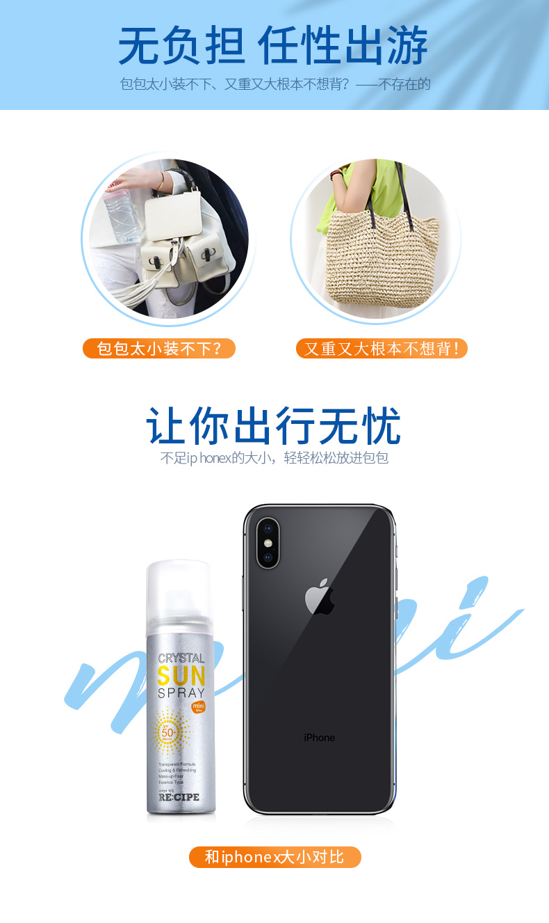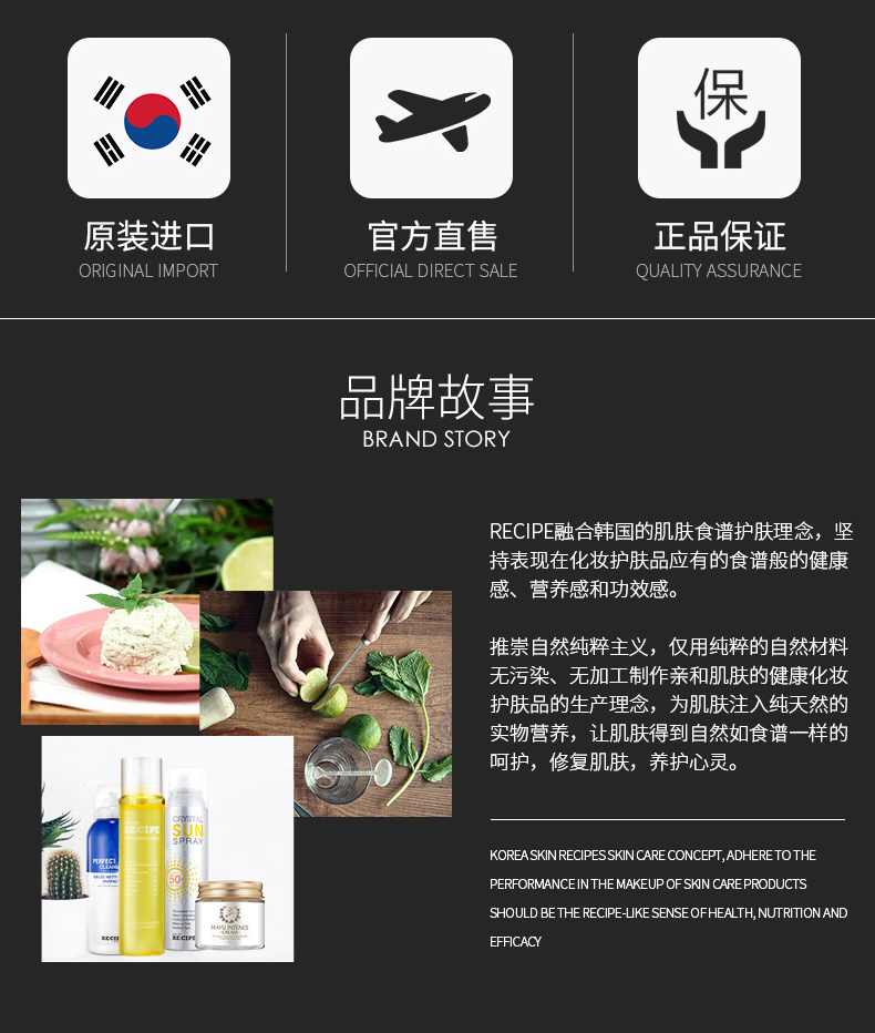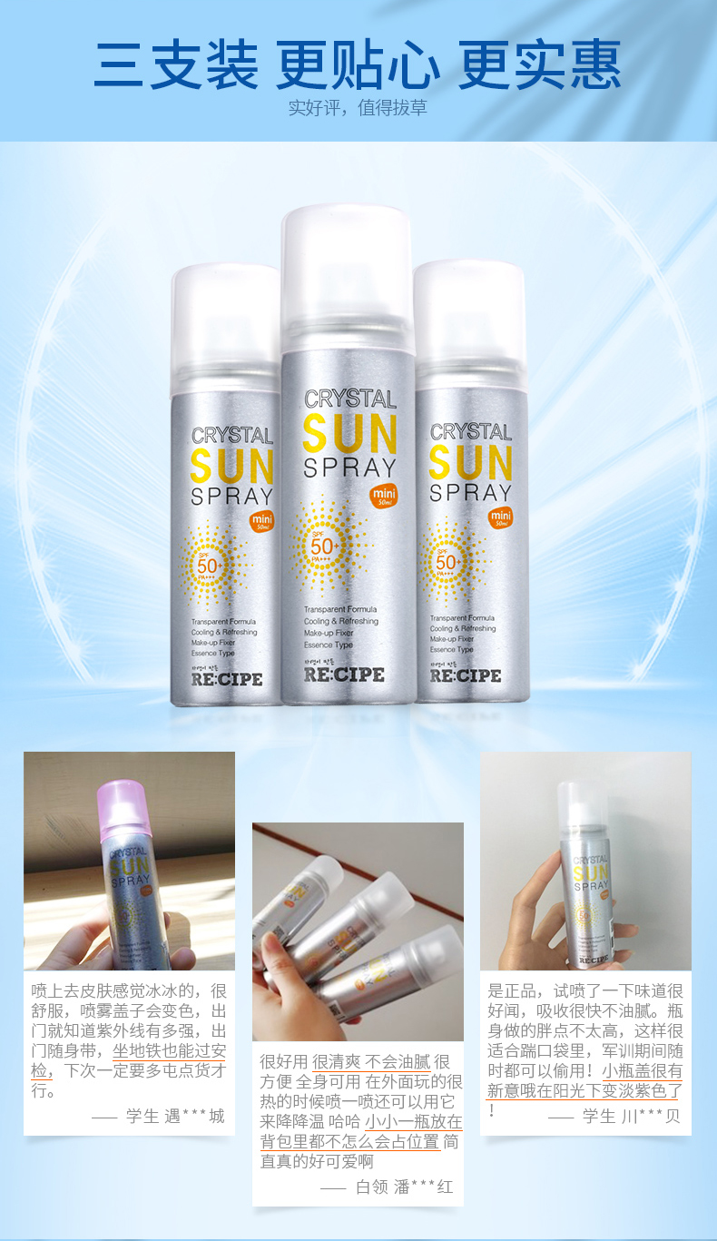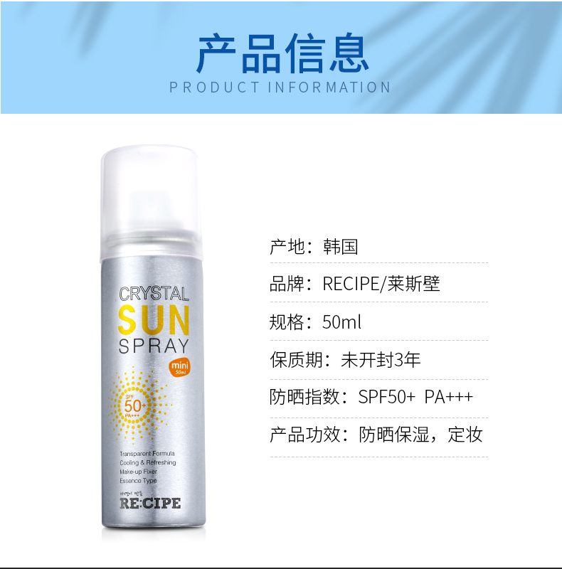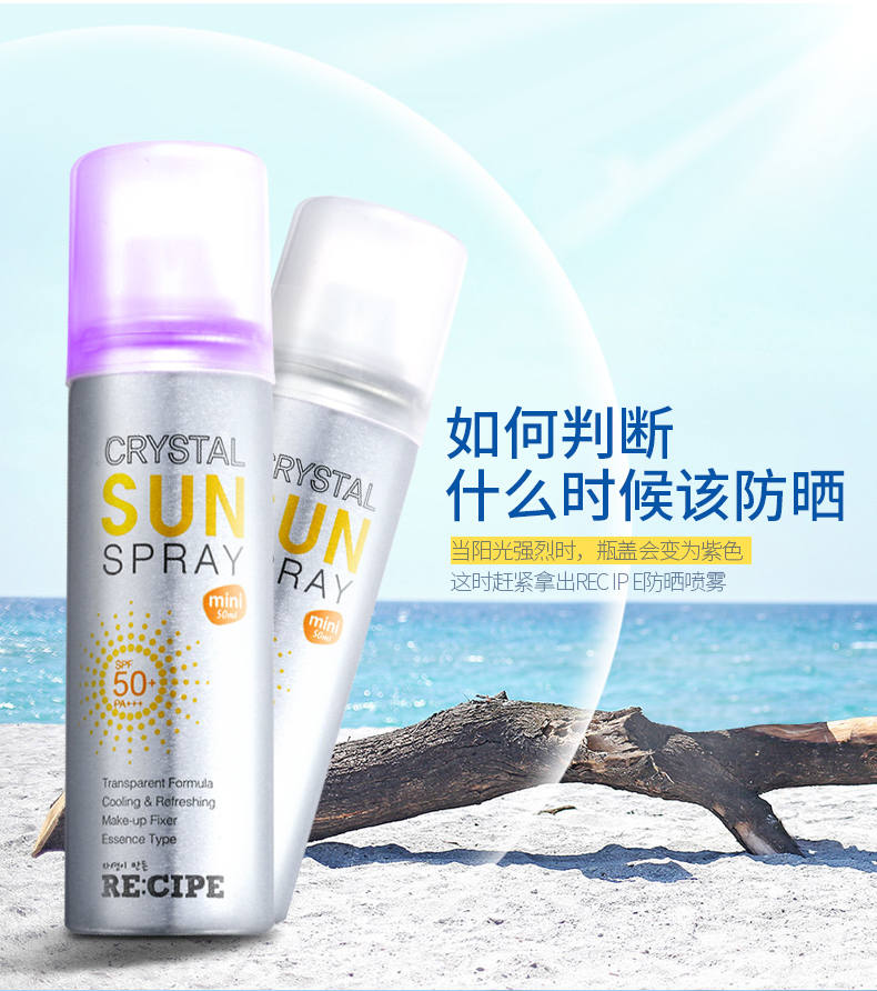 这款 RECIPE水晶防晒喷雾,韩国原装进口,不含化妆品类10种传统的有害物质,获得了食品标准级的韩国国立农产品认证局的有机产品认证书,通过了敏感性皮肤和无过敏测试,孕妇和儿童也可放心使用。
