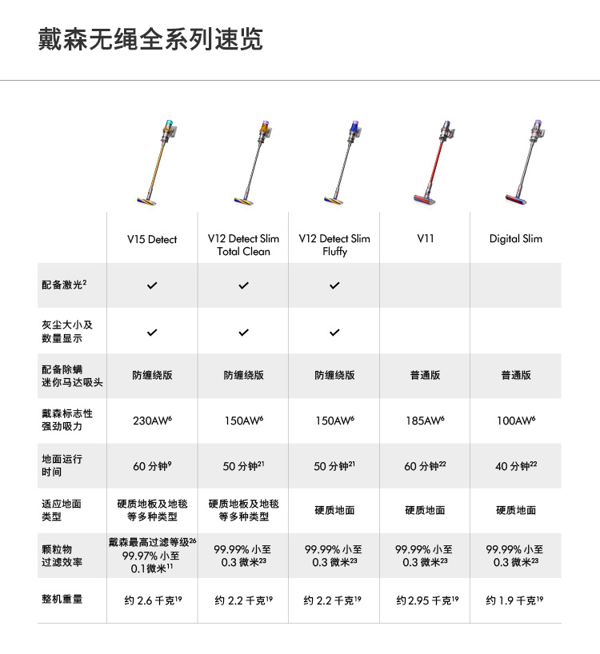 戴森于2021年4月推出V15系列,这款V15 detect total clean通过Hyperdymium旋速马达驱动可以产生230AW强劲吸力,14个同心气旋能够产生高达100000G的强劲离心力。