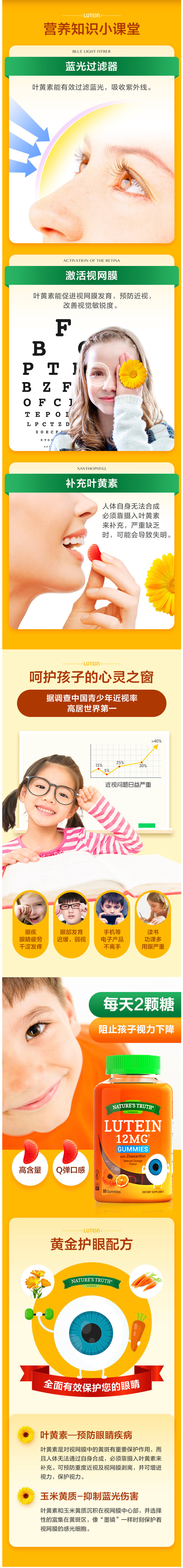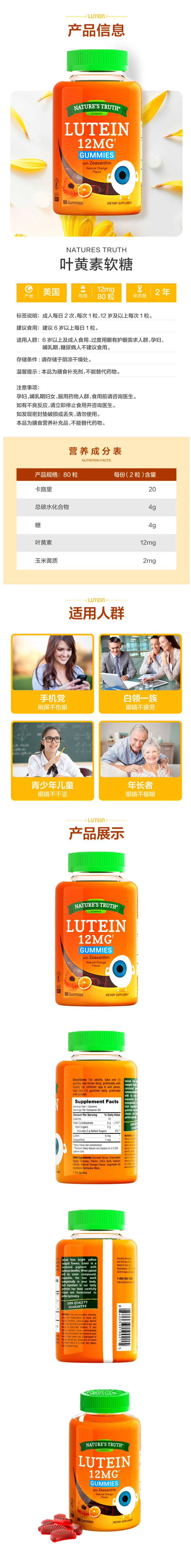 这款自然之珍 叶黄素软糖,美国进口,成人儿童均可,橙子口味,孩子爱吃,单颗含叶黄素6mg以上,每日2颗,约等于30根胡萝卜的叶黄素含量,呵护宝宝眼睛,减轻视疲劳。