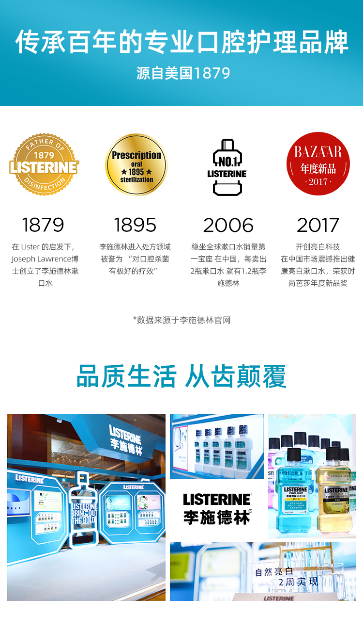 李施德林拥有125年的历史,它以消毒之父Joseph Lister命名。李施德林漱口水自从1914年正式投放零售市场,一直坚持其杀菌的核心功效,是第一个被美国牙医学会认可的非处方品牌漱口水,并获得了其它包括加拿大、澳大利亚、中国香港、爱尔兰等多个牙医学会的专业认证。