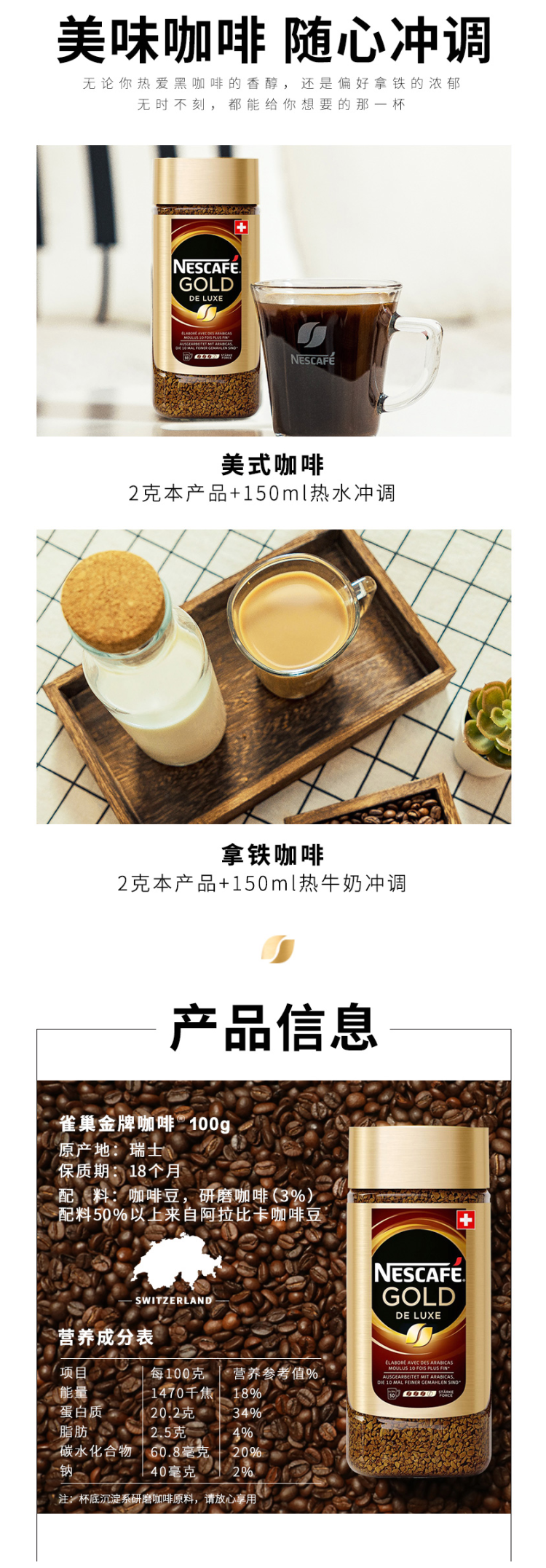 这款雀巢金牌黑咖啡,由瑞士原装进口,雀巢旗舰店发售,100%海外原装正品,盲测口感与现磨咖啡十分相近,不管是味道还是提神力都远超袋装速溶,而且不含植脂末和糖,非常健康。规格:100g*2罐 .
