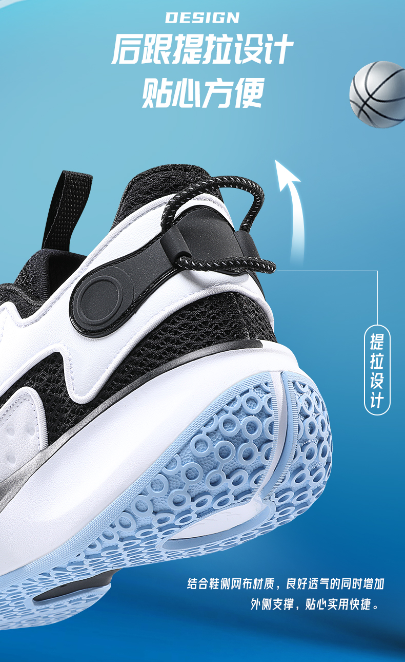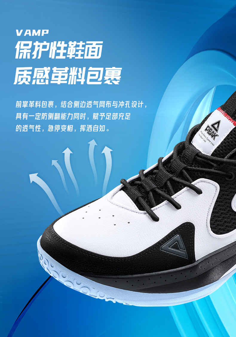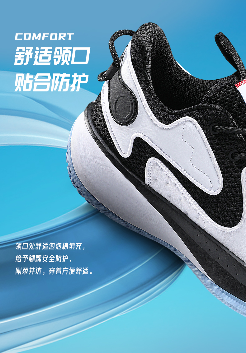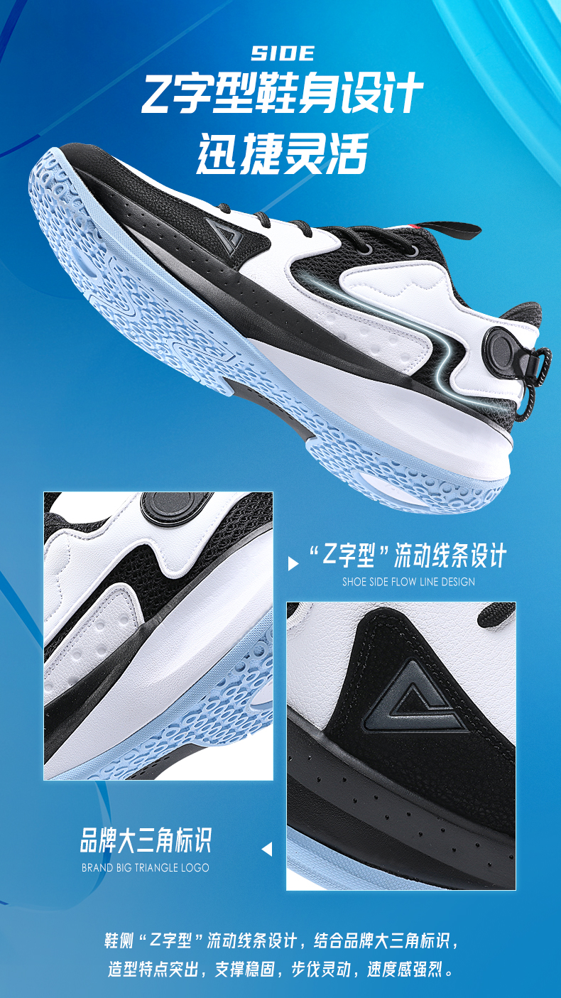 这款篮球鞋,以实战速度为理念,Z字型鞋身设计,质感皮革与透气网布结合,赋予足部良好的包裹性、透气性和支撑性,穿着迅捷灵活,急停变相、挥洒自如。