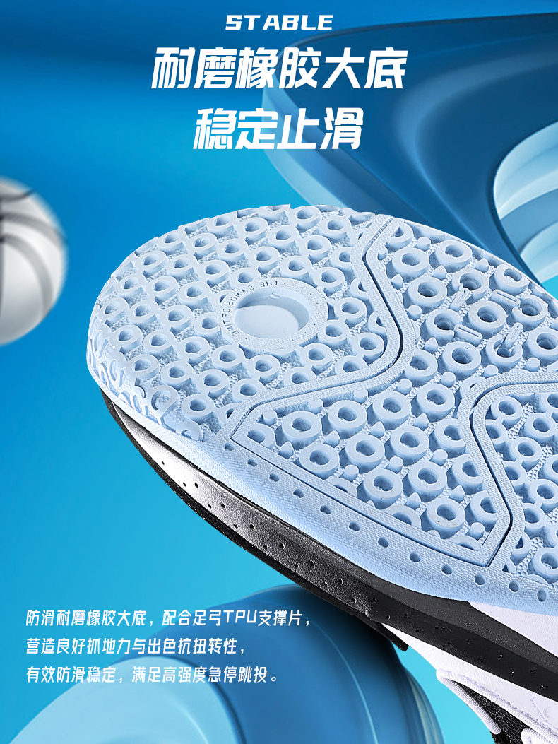防滑耐磨橡胶大底,配合足弓TPU支撑片,营造良好抓地力与出色抗扭转性,有效防滑稳定,满足高强度急停跳投。