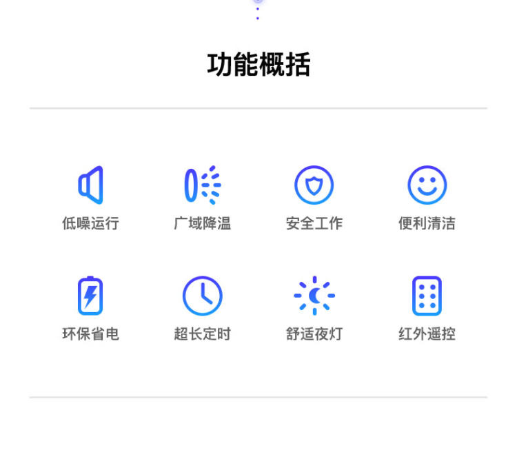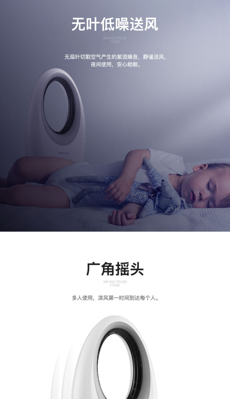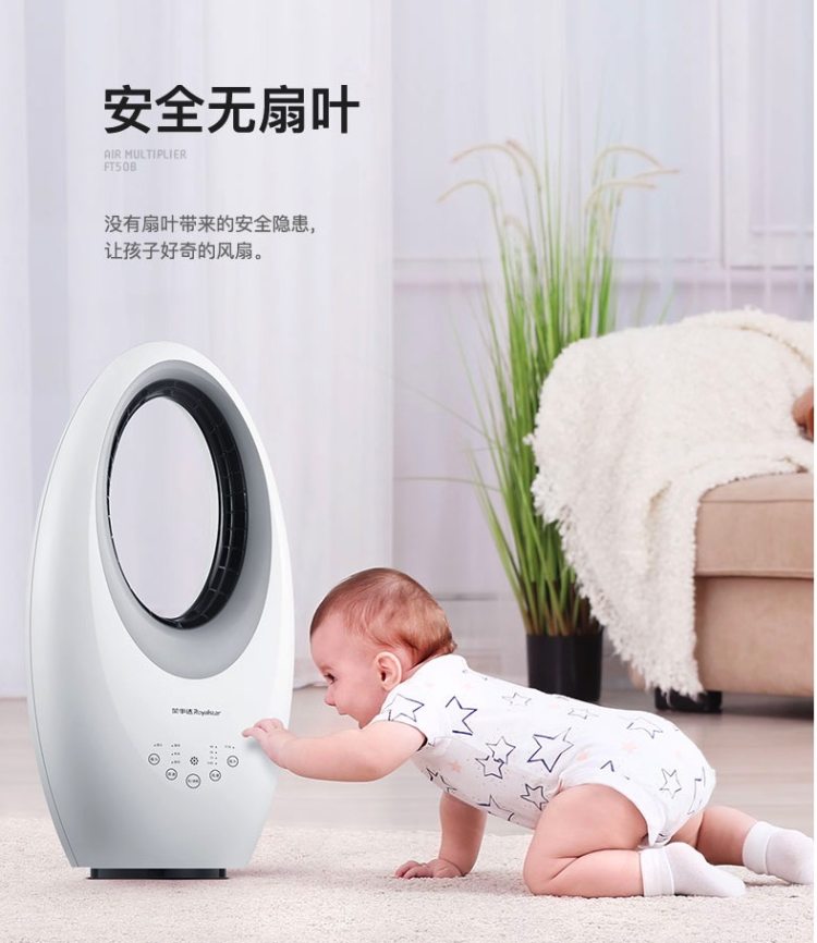 这款空气循环 静音无叶风扇,身材小巧,风力充盈,融合了超高的颜值和性能为一体,全新无扇叶设计,不用担心小孩子玩,并且吹出的风更柔和,支持超长定时、60°摇头广角送风、3档风力调节、红外遥控、触屏操作、静谧送风,四色小夜灯等实用的功能。