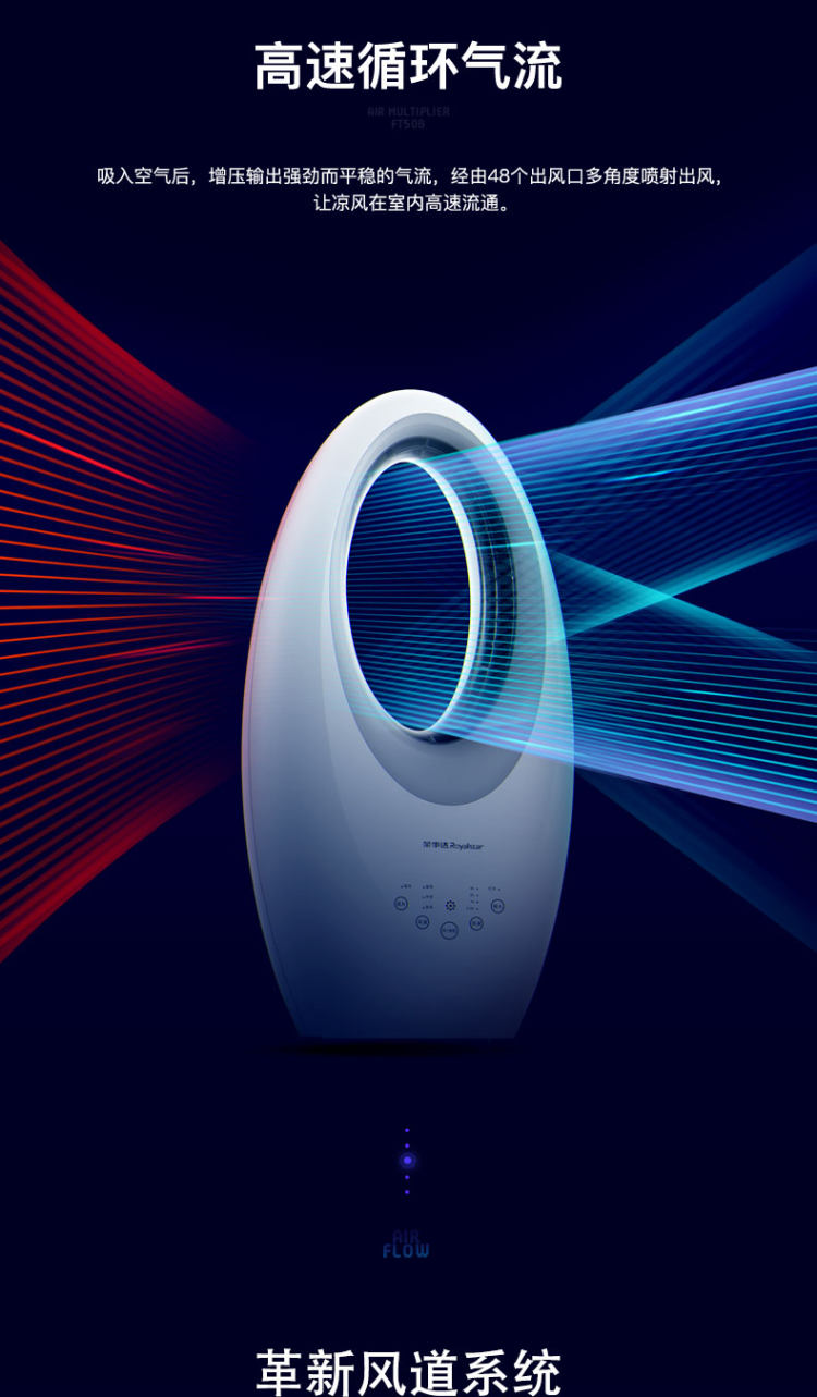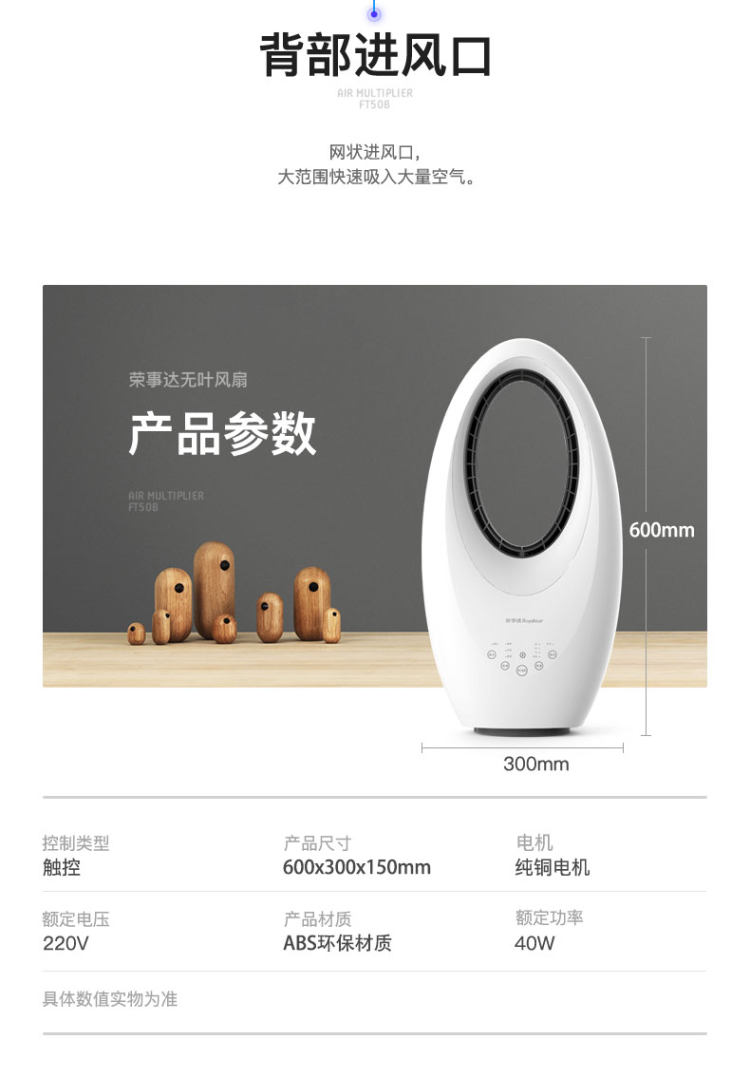 革新风道系统,涡轮增压后,经由48个出风口输出,风力强劲平稳;全身ABS环保材质,优雅弧线设计,表面光亮圆滑,易清洁;无机械按钮,可远程遥控,方便使用。尺寸:600*300*150mm。重量3kg。