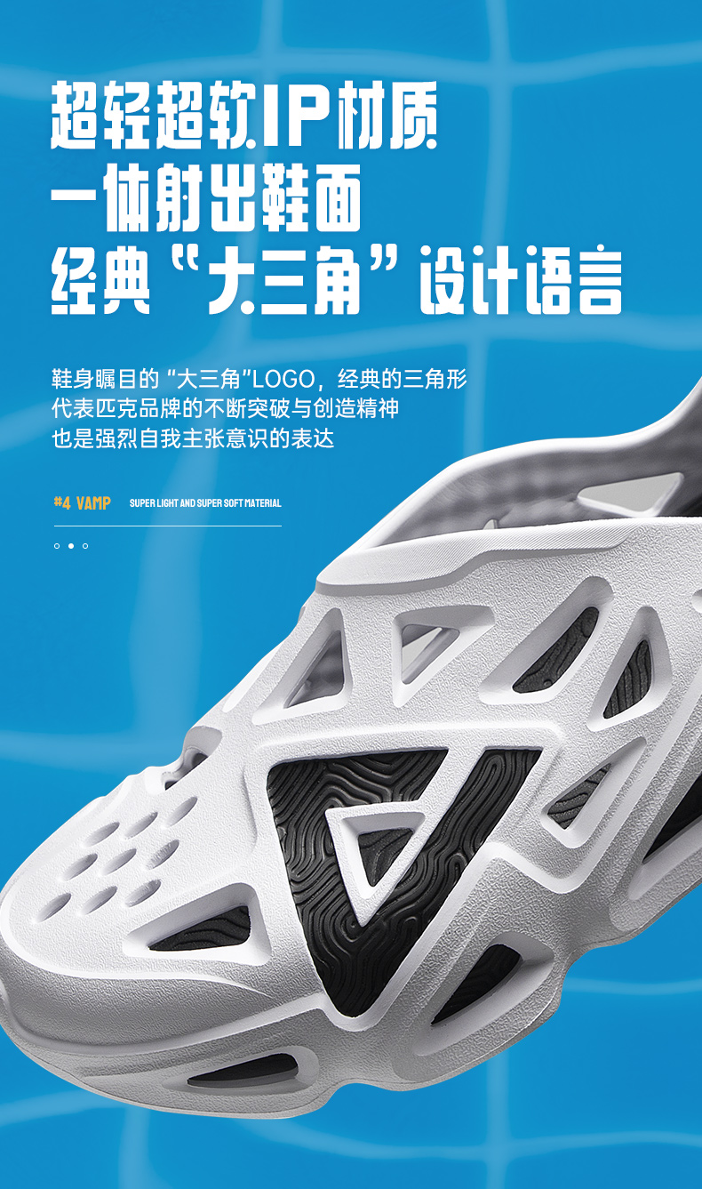 搭载与匹克拖鞋同样的全掌态极科技,能够应力感知,弹柔并济,软弹舒适;不对称领口设计,符合人体工程学的侧面造,以及后仰35°的微翘后鞋口,让你抬脚轻松一蹬就能穿上,解放双手,方便穿与脱。