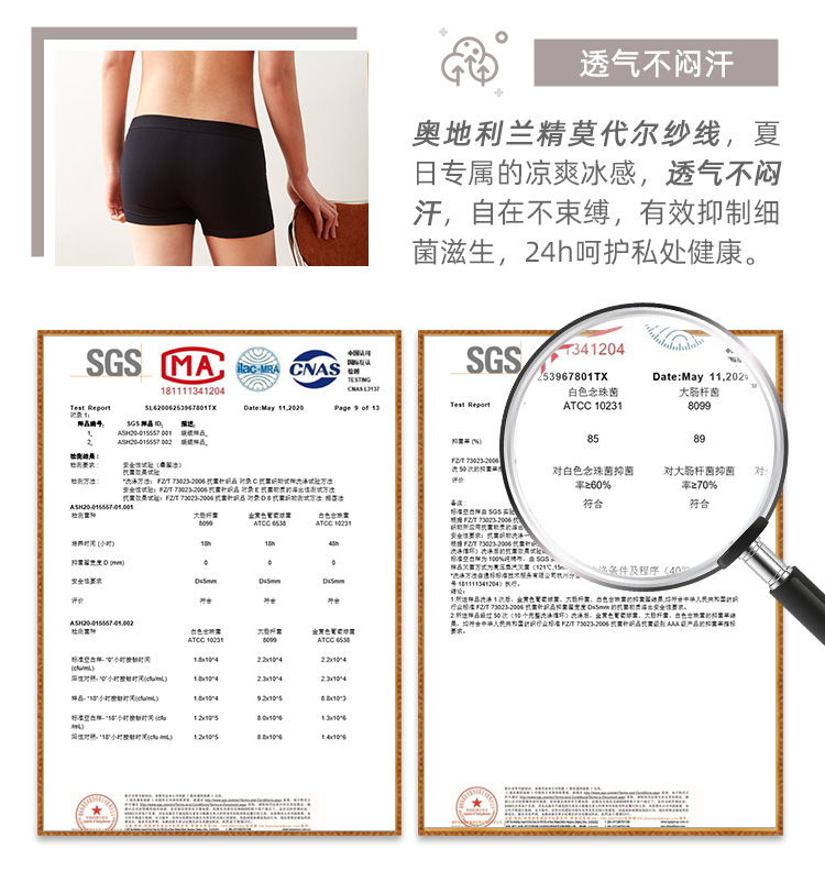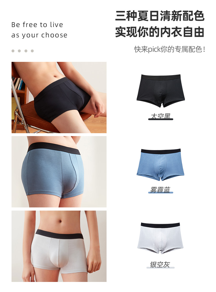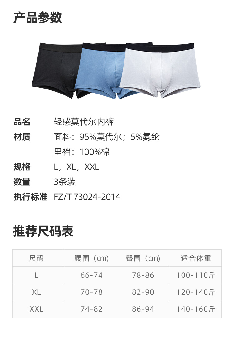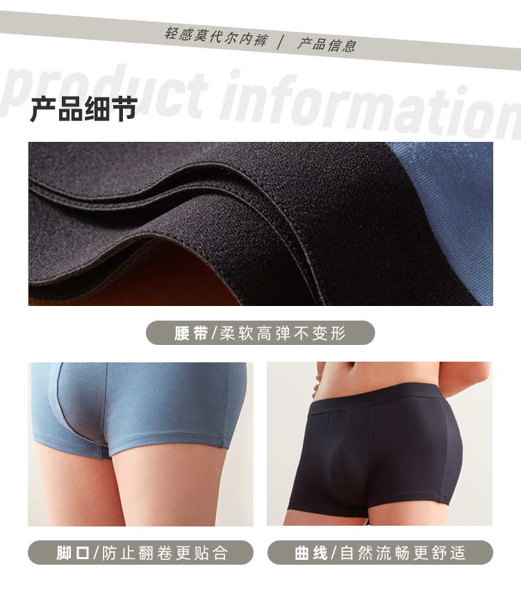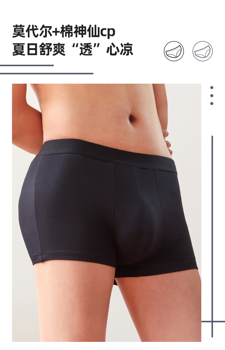 这款淘宝心选的男平角内裤,面料采用来自于奥地利兰精公司的莫代尔,支数是50支,含量达到95%,触感非常柔,吸湿、顺滑、透气、垂感好,小编就买过几件莫代尔的内衣,亲肤感非常好,仅次于桑蚕丝(丝绸),是我的最爱的面料;同时还混了5%弹力纤维,灵活展身,不紧不绷。