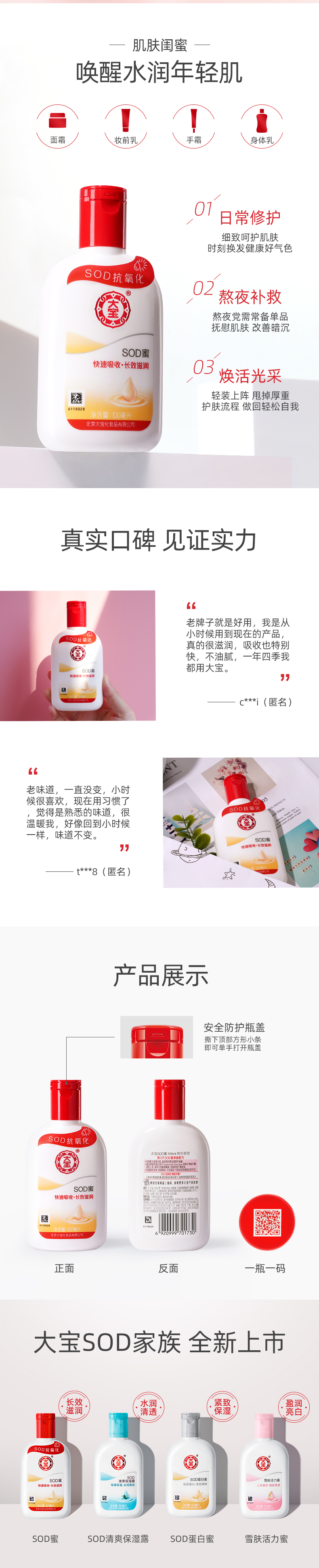 大宝是家喻户晓的品牌,这款SOD蜜,无刺激配方,适合各种肤质的人使用,含有黄芪精华,延展性好,质地清透,大宝以低价又实用的产品,赢得口碑。平时用来抹手、身体,糙一点的汉子还会用来抹脸。是一款全家适宜的产品。领券链接点此