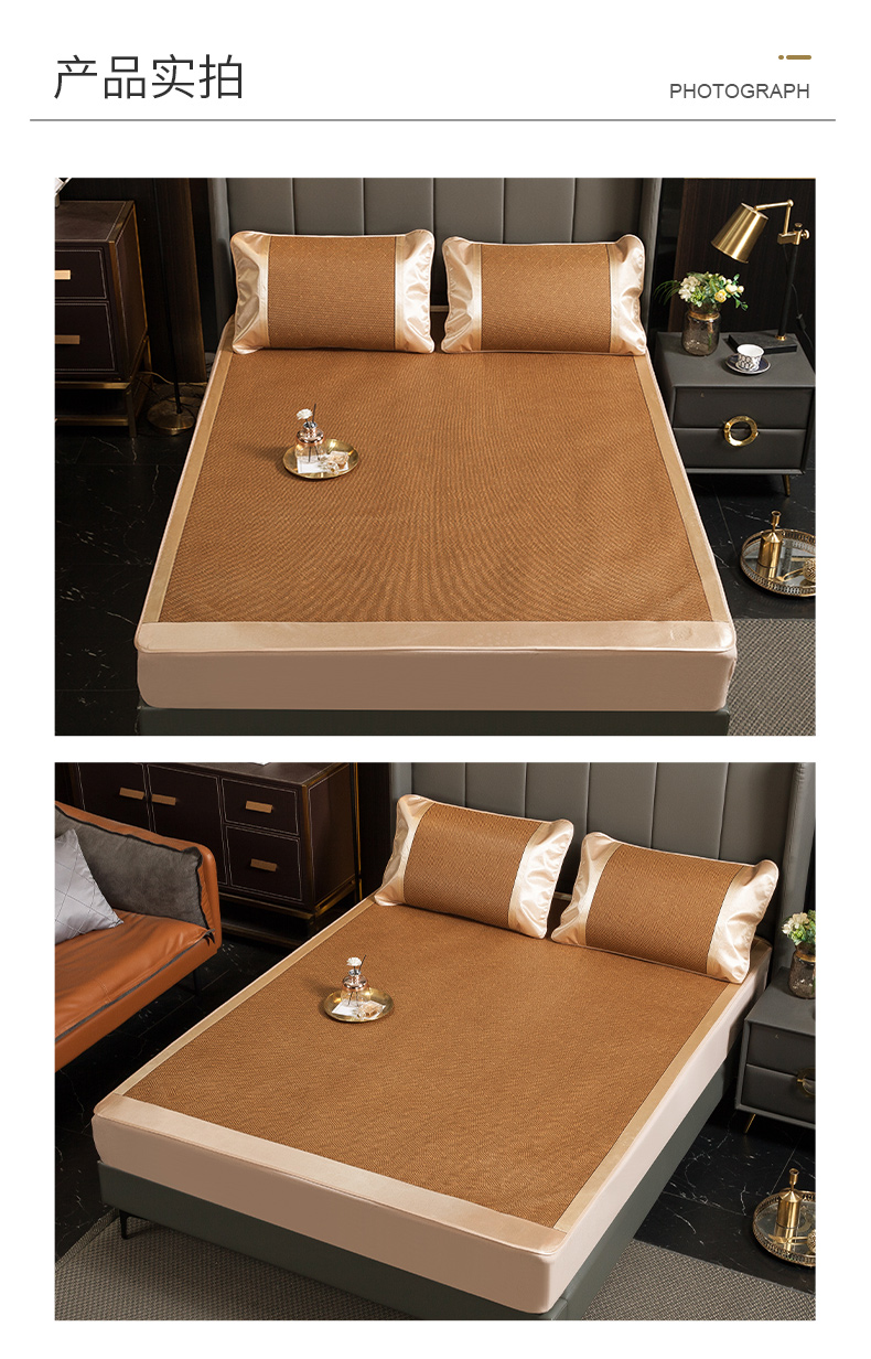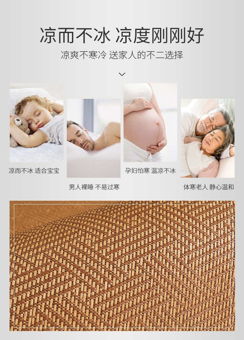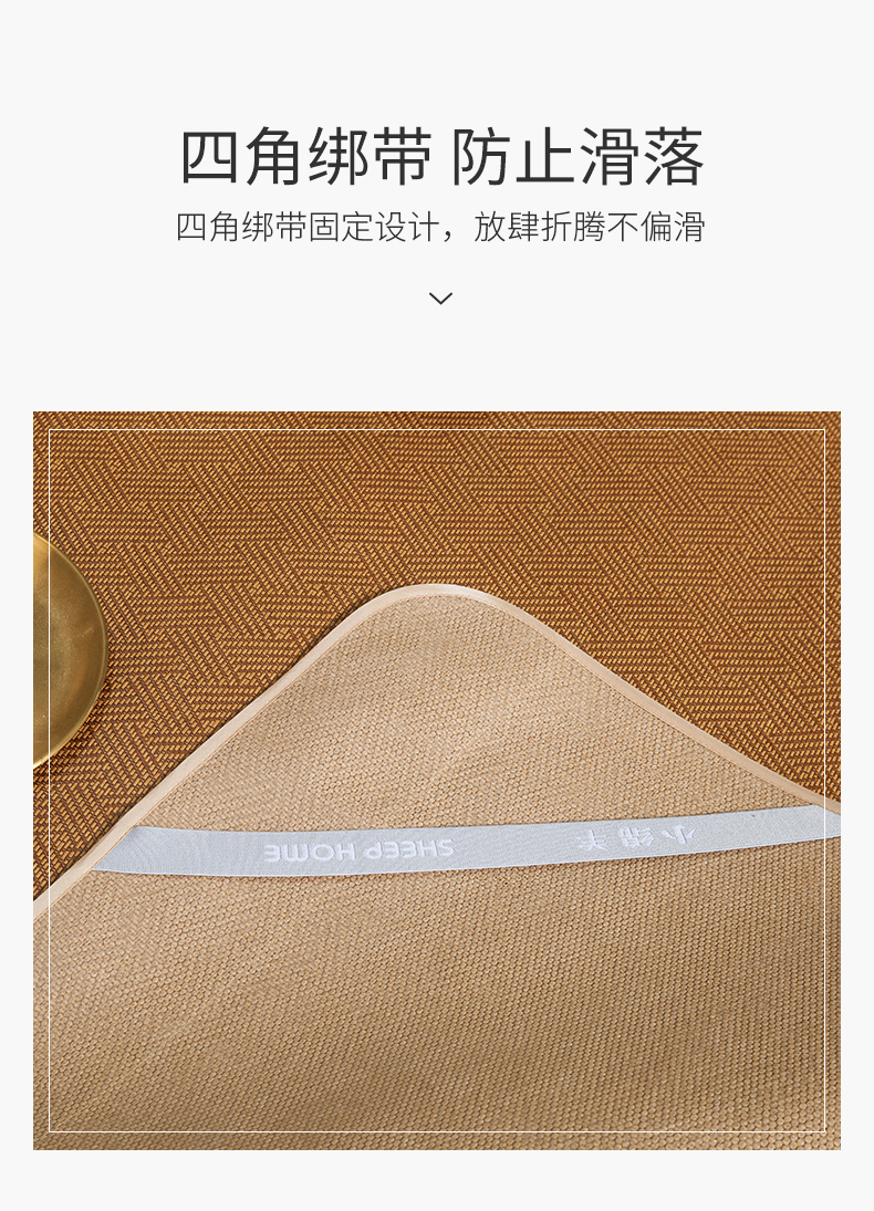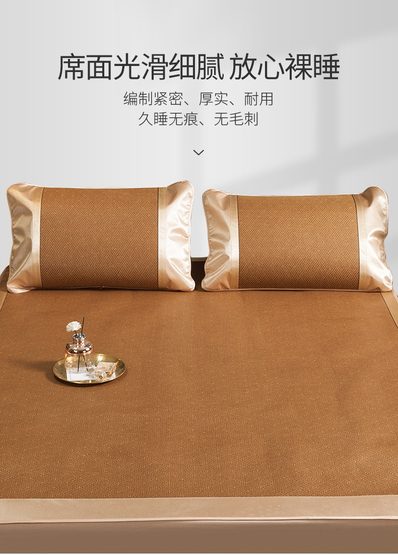 席面编织紧密,光滑细腻,厚实耐用无毛刺,睡在上面凉而不冰,吸湿透气不闷热;配四角绑带固定,不会轻易偏滑。