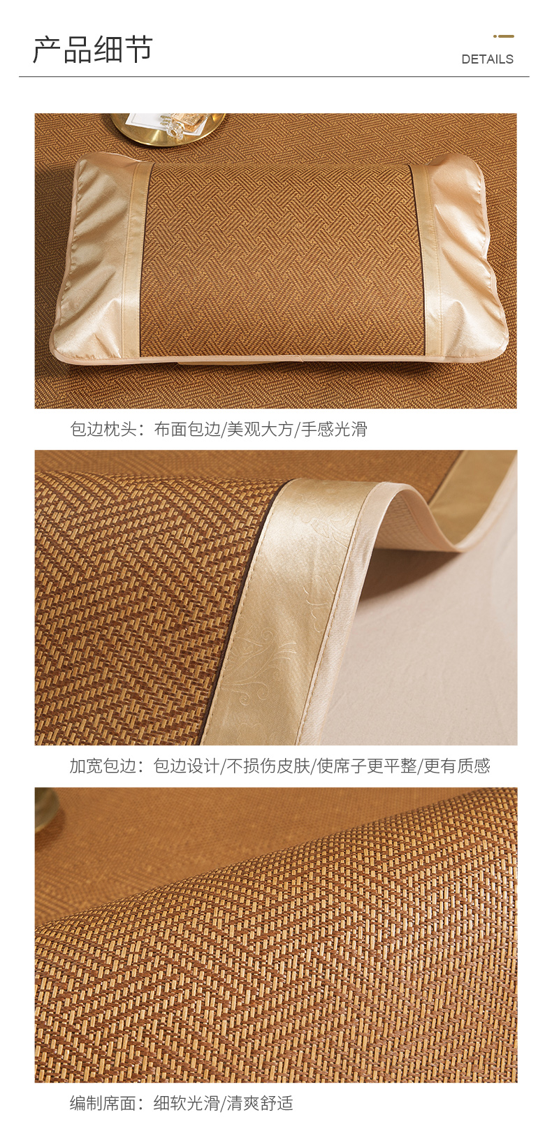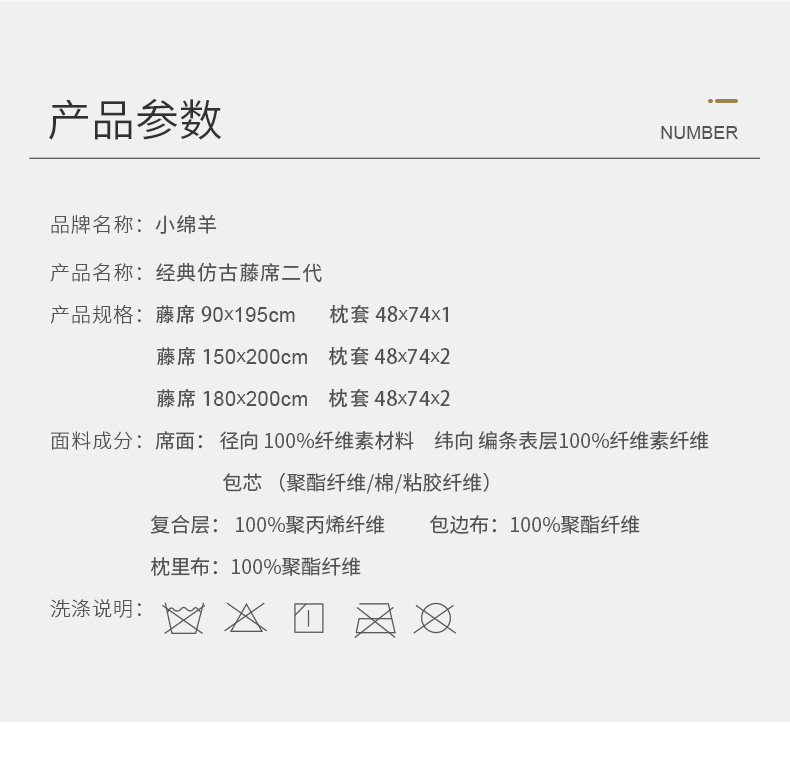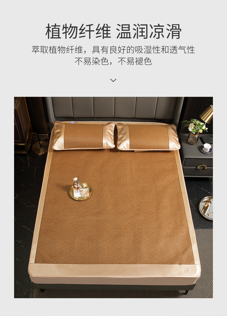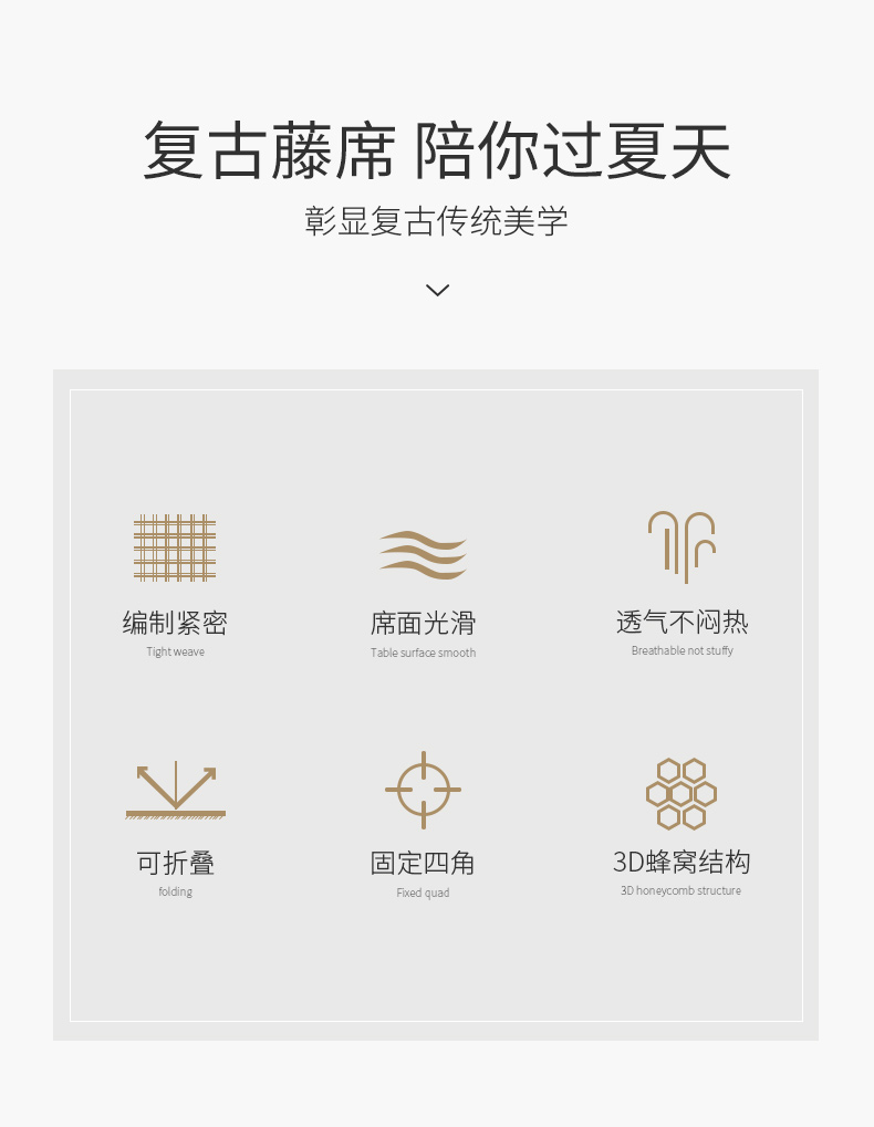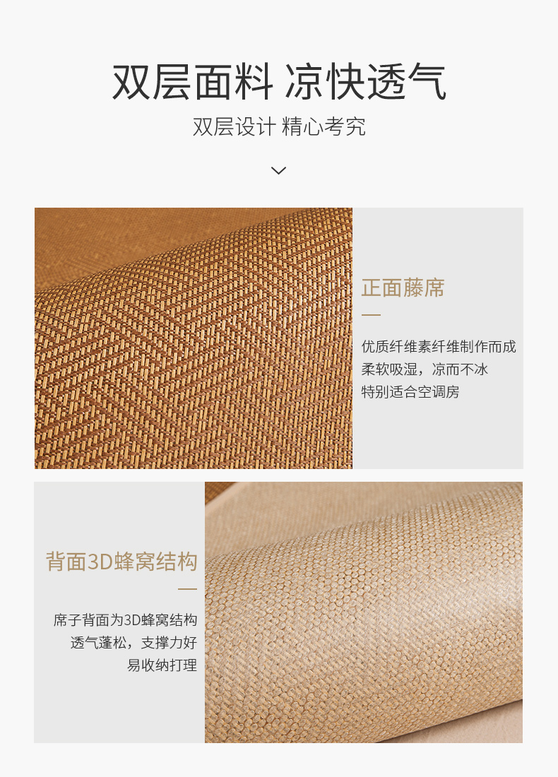 这款小绵羊 仿古纯藤席三件套,拥有双层面料组成,正面藤席使用优质纤维素纤维制成,柔软吸湿,凉而不冰,适用于空调房。背面3D蜂窝结构,透气蓬松,支撑力好。