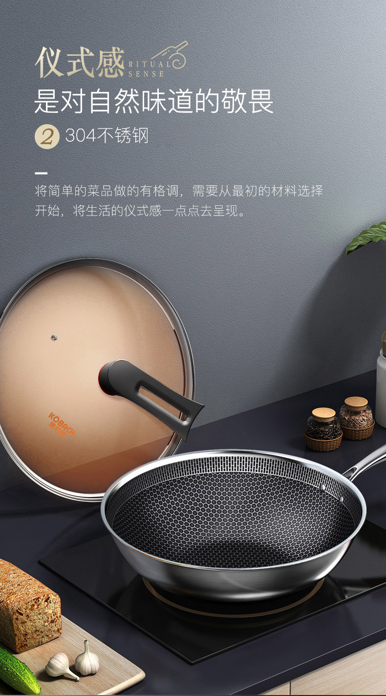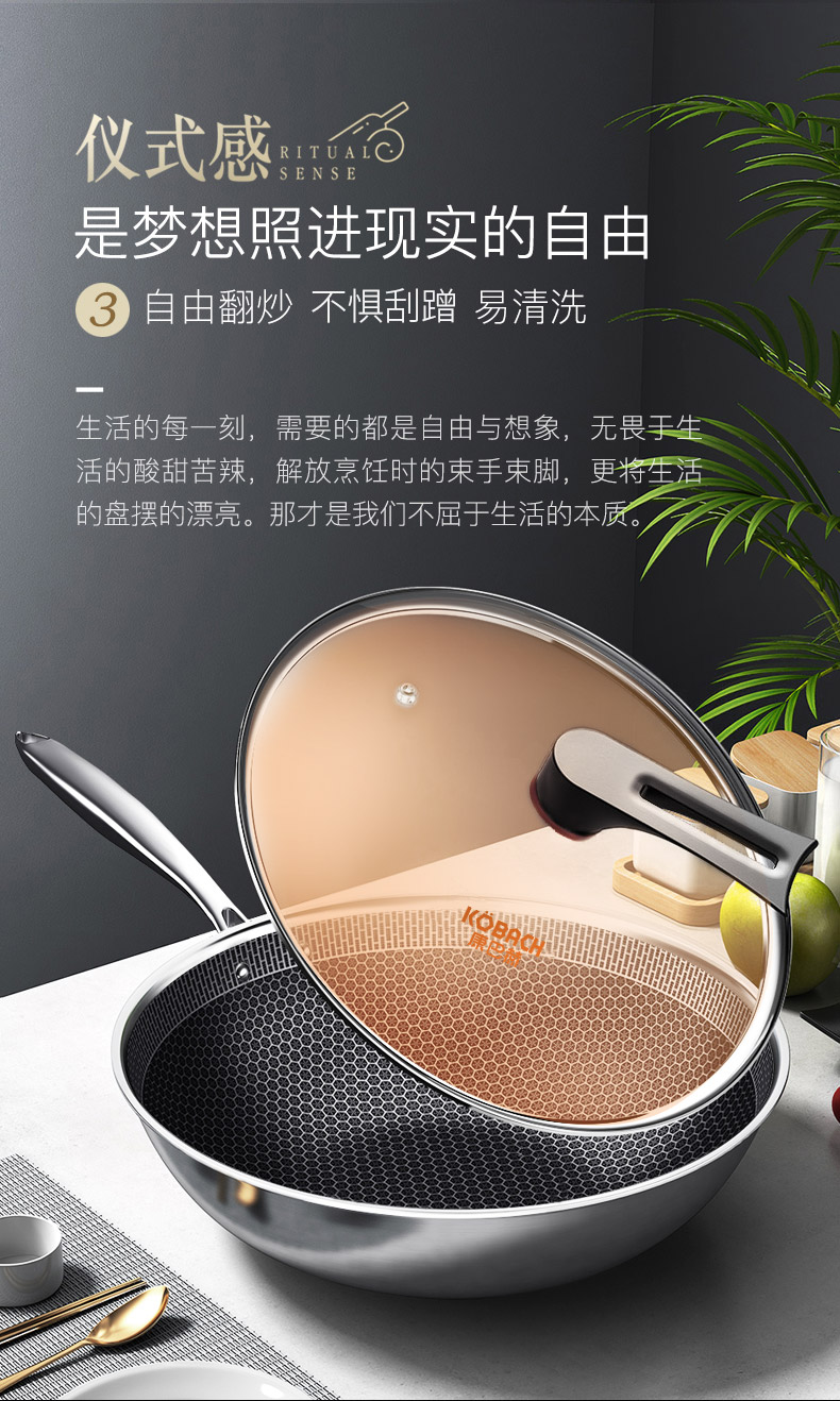 这款康巴赫不粘锅,采用了比C级老款半屏更高的E级全面不粘技术,实现锅内的全方位防粘。锅身是包括食品级304不锈钢在内的,共五层冲压,一体成型设计,更为牢固耐用。其中,锅内的蚀刻不粘工艺实现了蜂窝纹理全面覆盖,大幅度提高不粘特性,且少油烟,锅底不易发黄、不怕剐蹭,一擦即净,方便清理。