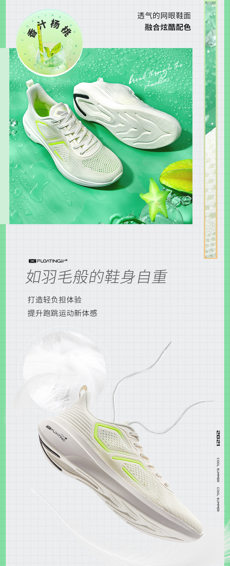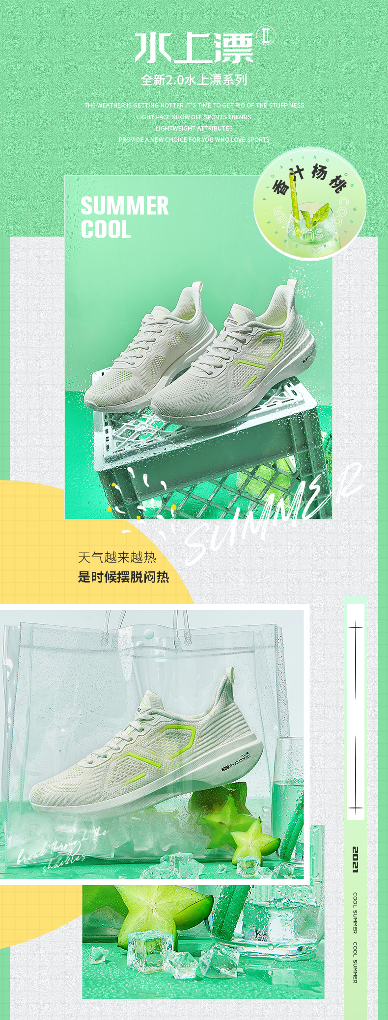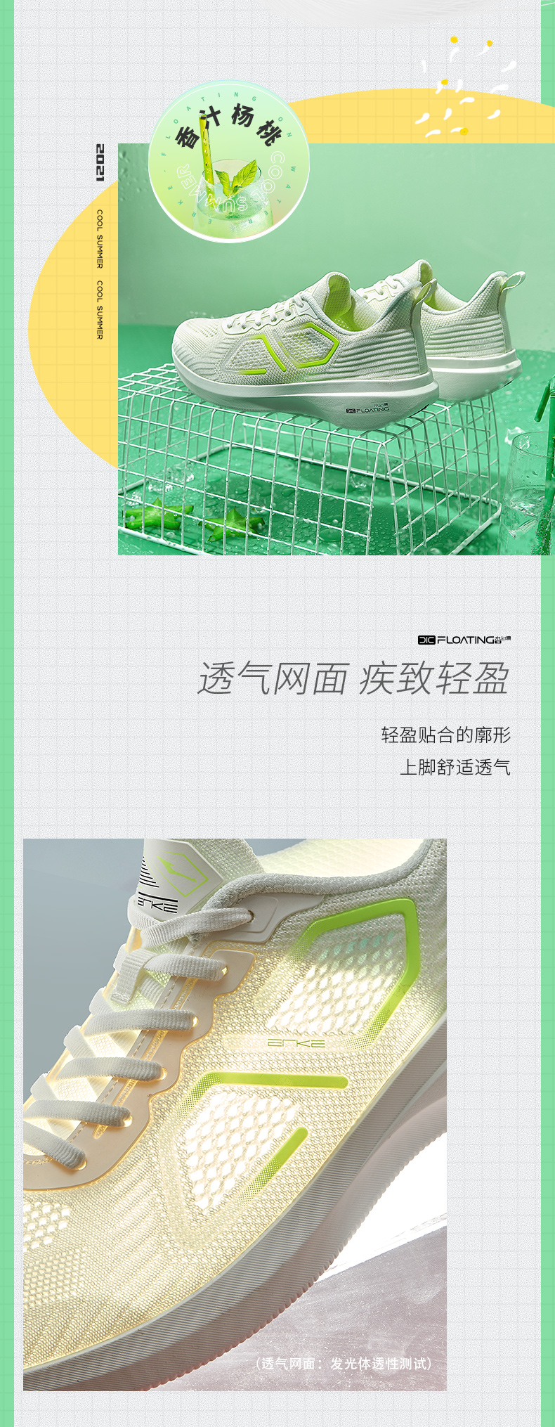 鸿星尔克今年全新的“水上漂”系列,专为夏季设计,鞋面为超透气的一体织鞋面,大块网眼,夏季穿着舒适透气,专利的“水上漂”中底,一体成型EVA材质,如羽毛般的鞋身自重,轻盈运动。