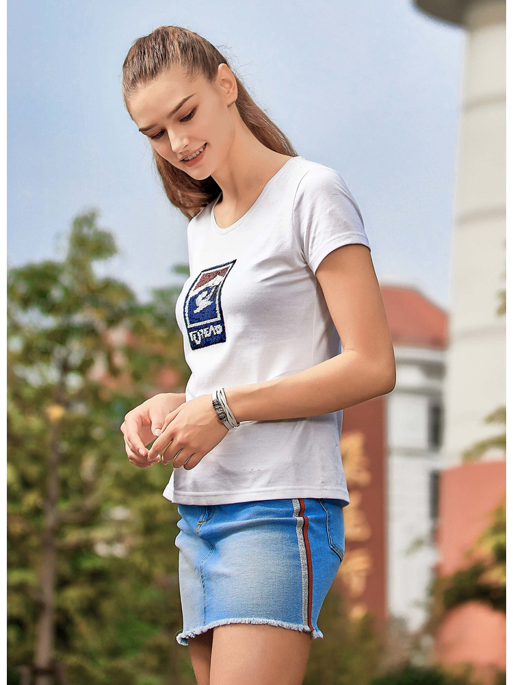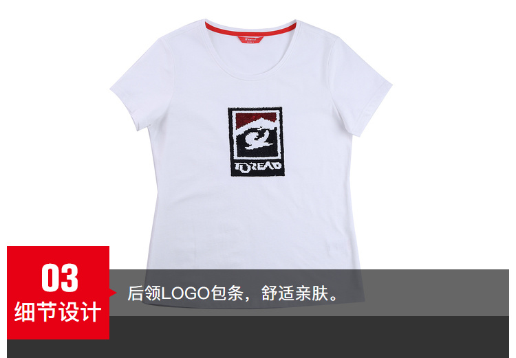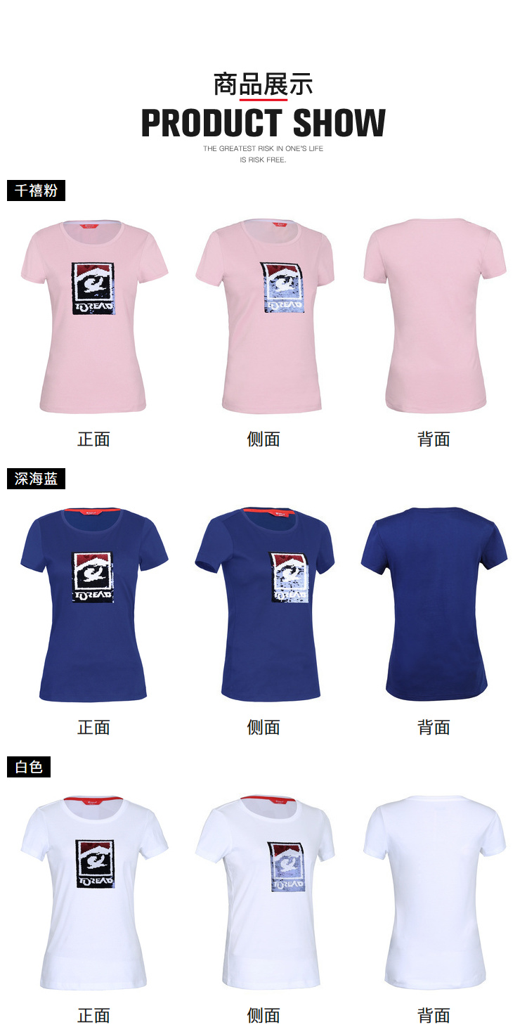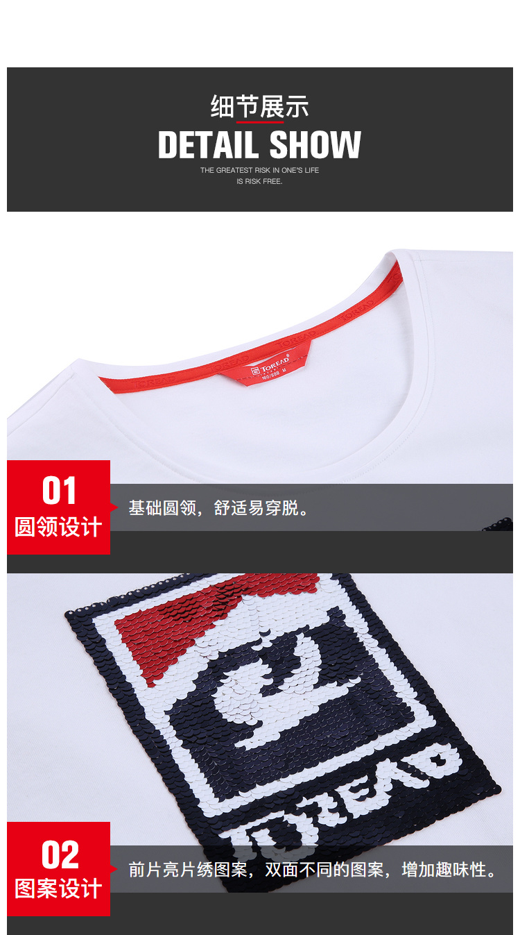在款式上,修身版型,前胸是亮片绣图案,双面不同的图案,增加趣味性,后领是Logo包边,舒适不摩后颈。